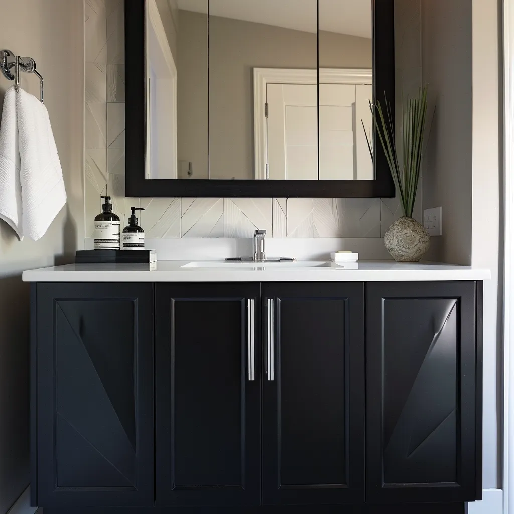 Projektując zabudowę meblową w łazience, warto pomyśleć o praktycznych schowkach i szafkach wnękowych w czarnym kolorze. Takie rozwiązania nie tylko maksymalnie wykorzystują dostępną przestrzeń, ale również tworzą spójną, elegancką całość. Czarne fronty szafek mogą być gładkie lub zdobione subtelnymi frezowaniami, które dodają głębi i charakteru całej zabudowie.