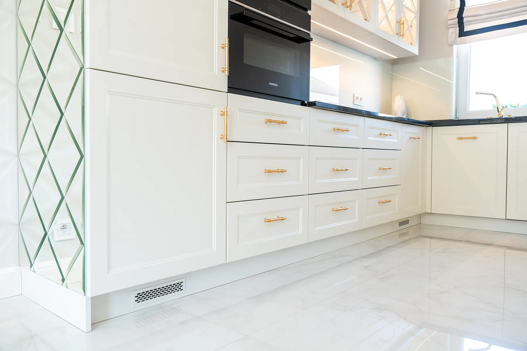 Wir präsentieren eine außergewöhnliche Küche, die zeitlose Eleganz und moderne Lösungen vereint und perfekt den Geist des Glamour-Stils widerspiegelt. Jedes Element dieses Interieurs wurde mit dem Gedanken entworfen, maximale Funktionalität zu gewährleisten, ohne auf ein luxuriöses Erscheinungsbild zu verzichten.