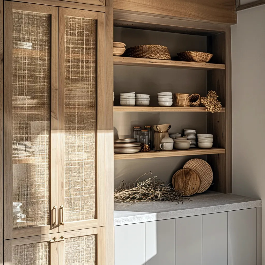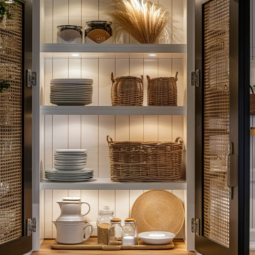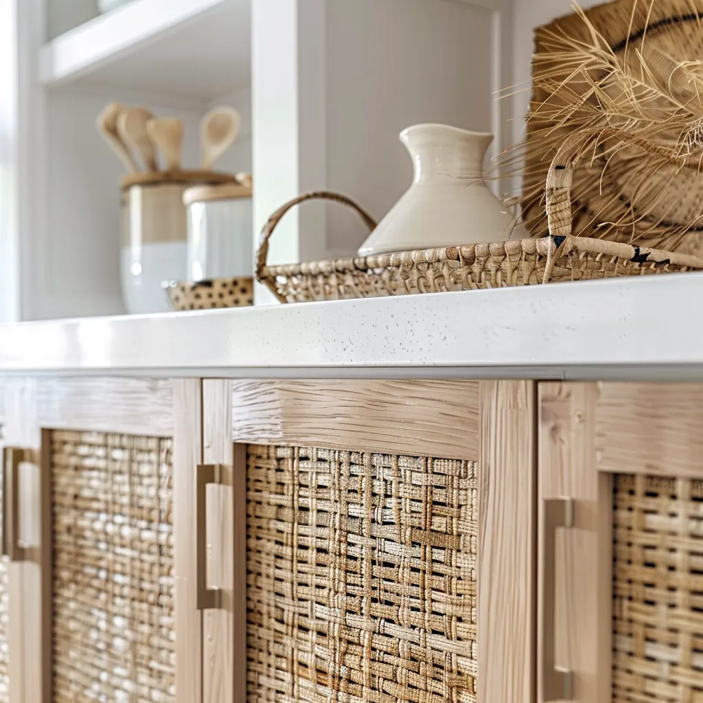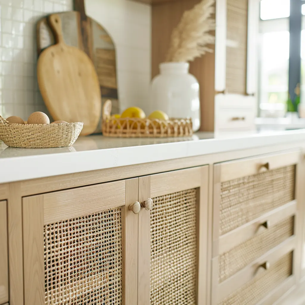 Rattan może zostać wykorzystany także w mniej oczywisty sposób – jako dekoracyjne panele na frontach szafek. Tego typu rozwiązanie nie tylko doda głębi i tekstury kuchennym zabudowom, ale również uczyni całość bardziej otwartą i mniej monolityczną. Wykorzystanie rattanu w takiej formie może przynieść świetny efekt wizualny, zwłaszcza gdy jest połączony z jasnymi, drewnianymi powierzchniami.