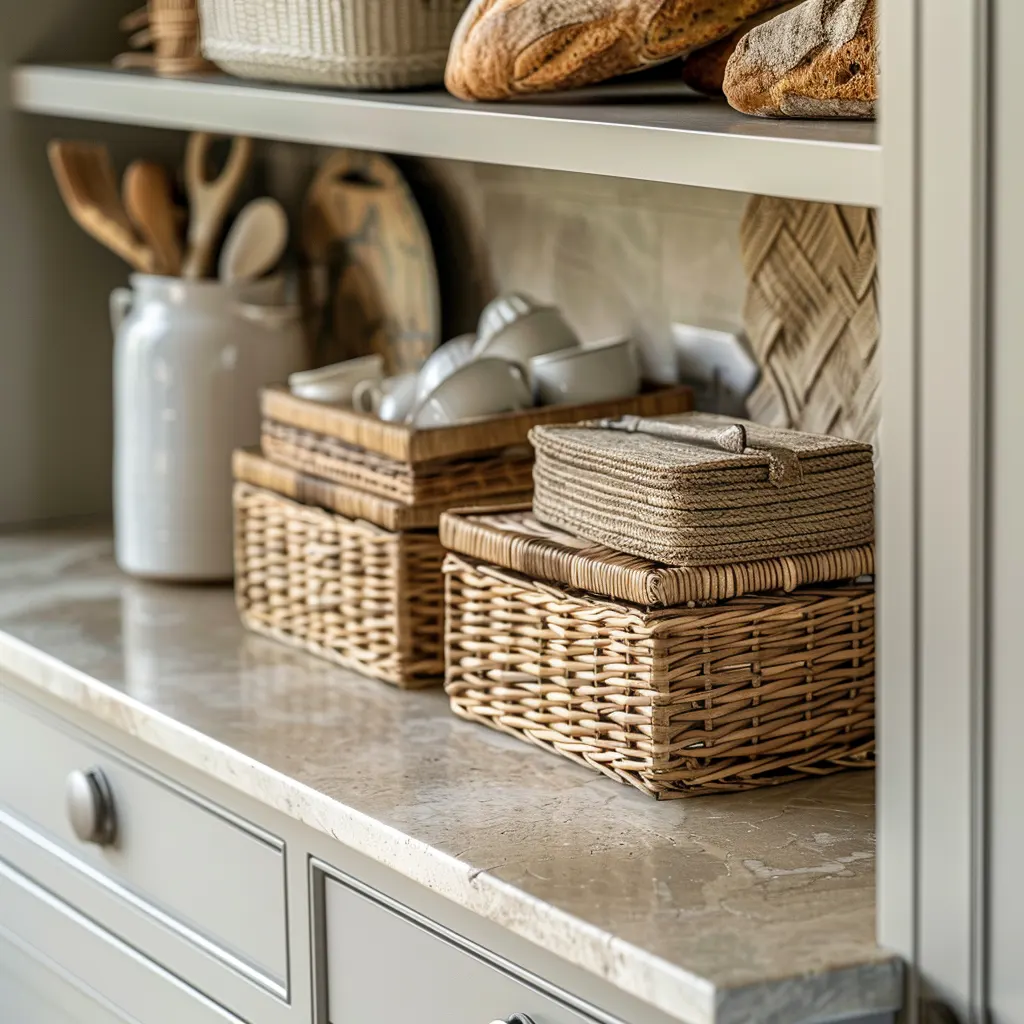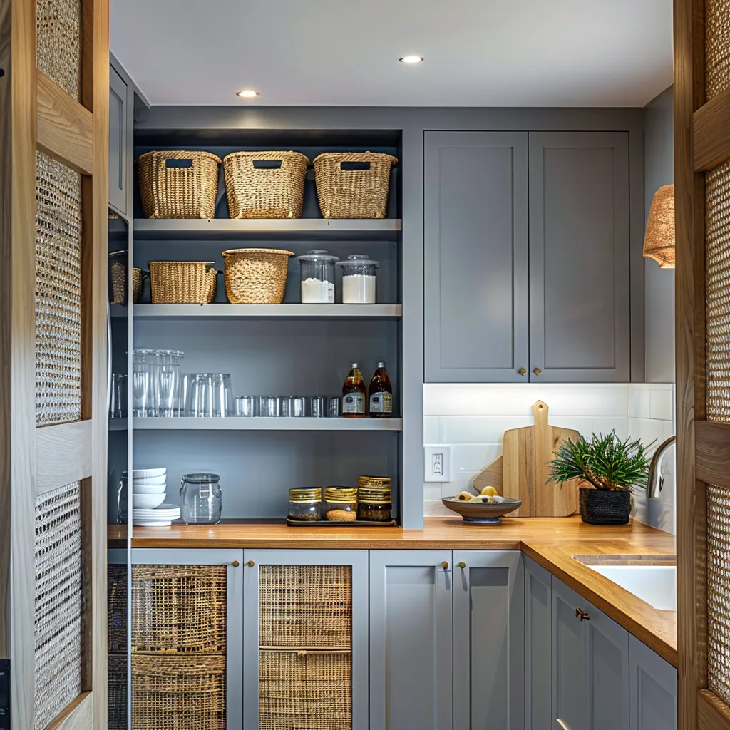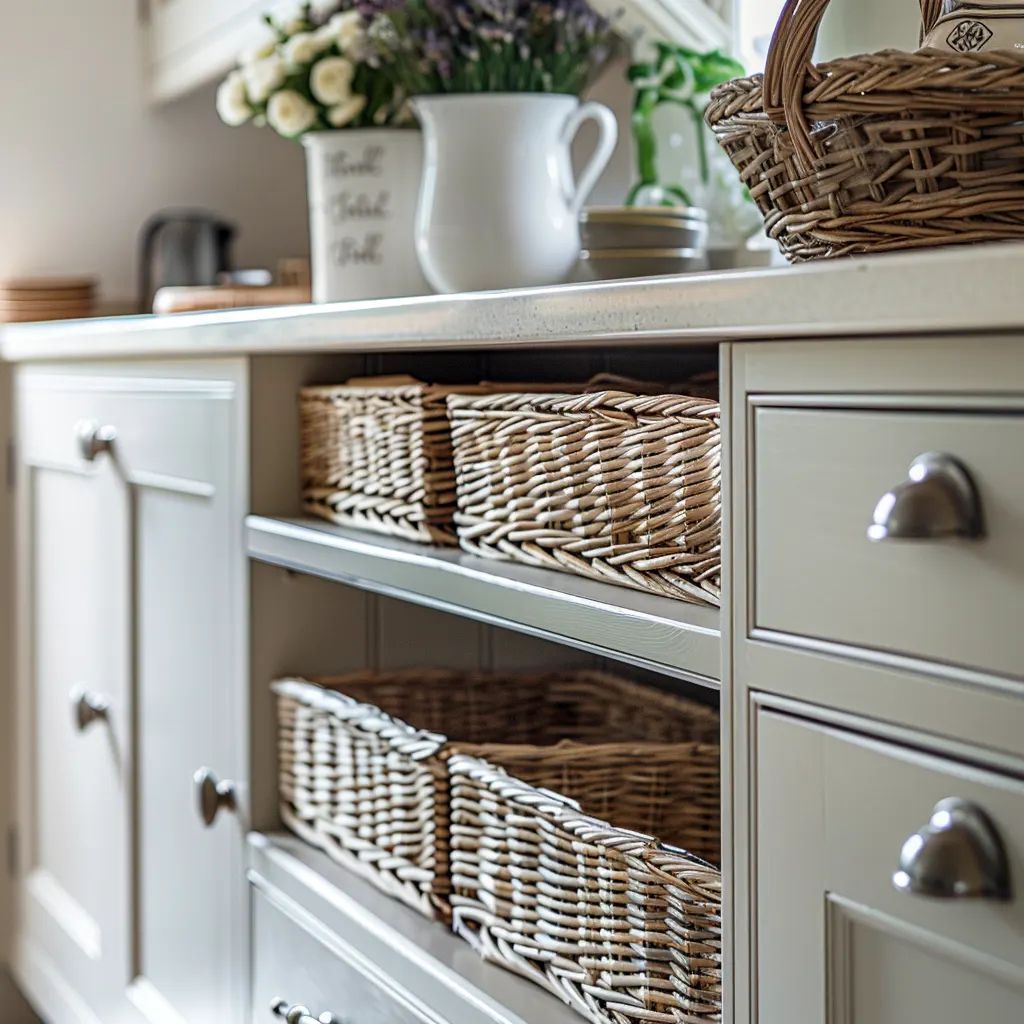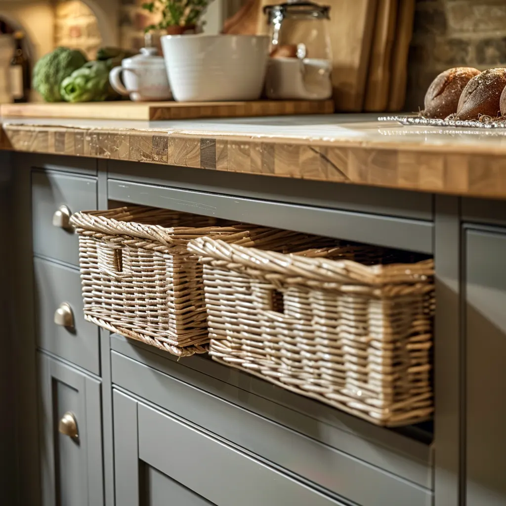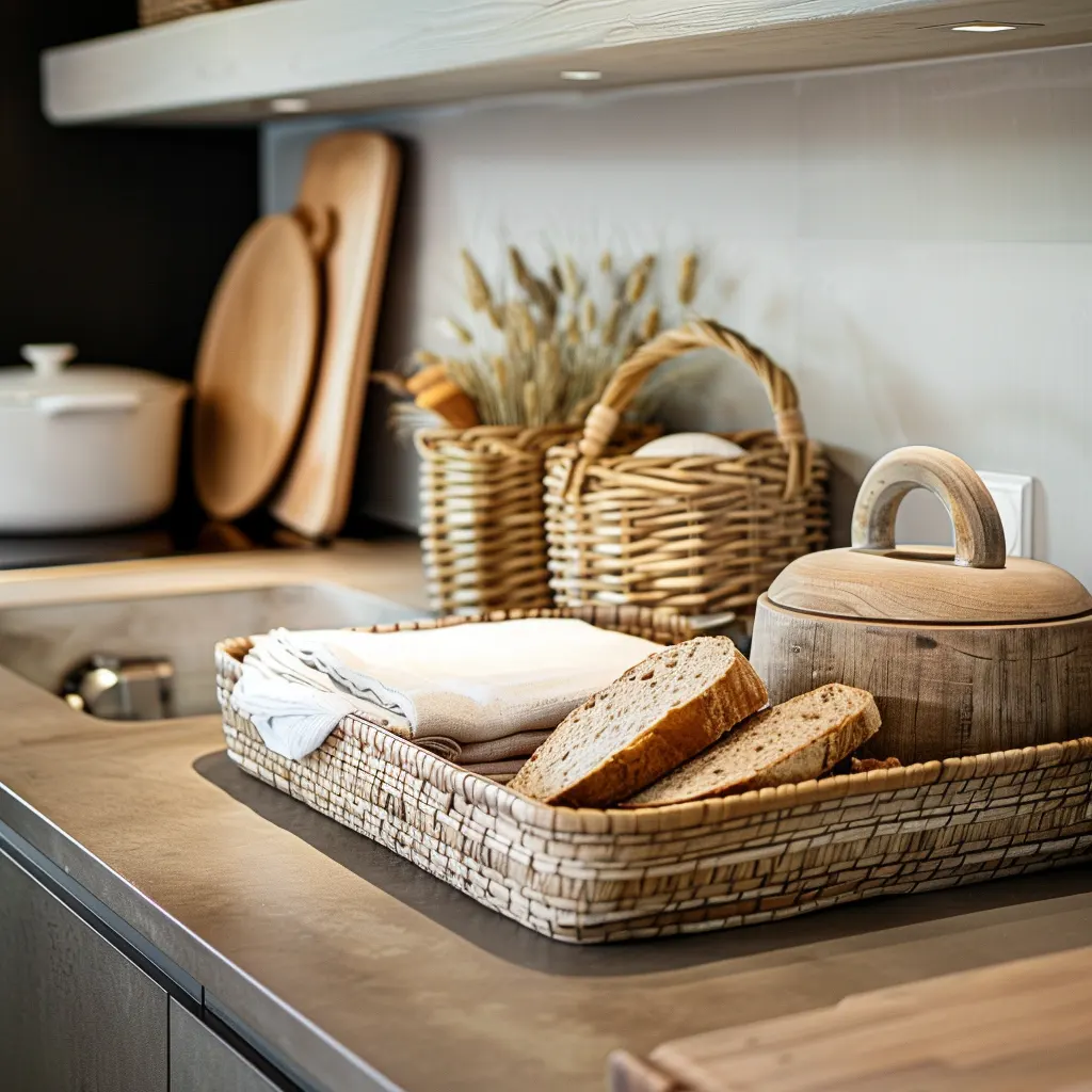 Rattan może zostać wykorzystany także w mniej oczywisty sposób – jako dekoracyjne panele na frontach szafek. Tego typu rozwiązanie nie tylko doda głębi i tekstury kuchennym zabudowom, ale również uczyni całość bardziej otwartą i mniej monolityczną. Wykorzystanie rattanu w takiej formie może przynieść świetny efekt wizualny, zwłaszcza gdy jest połączony z jasnymi, drewnianymi powierzchniami.