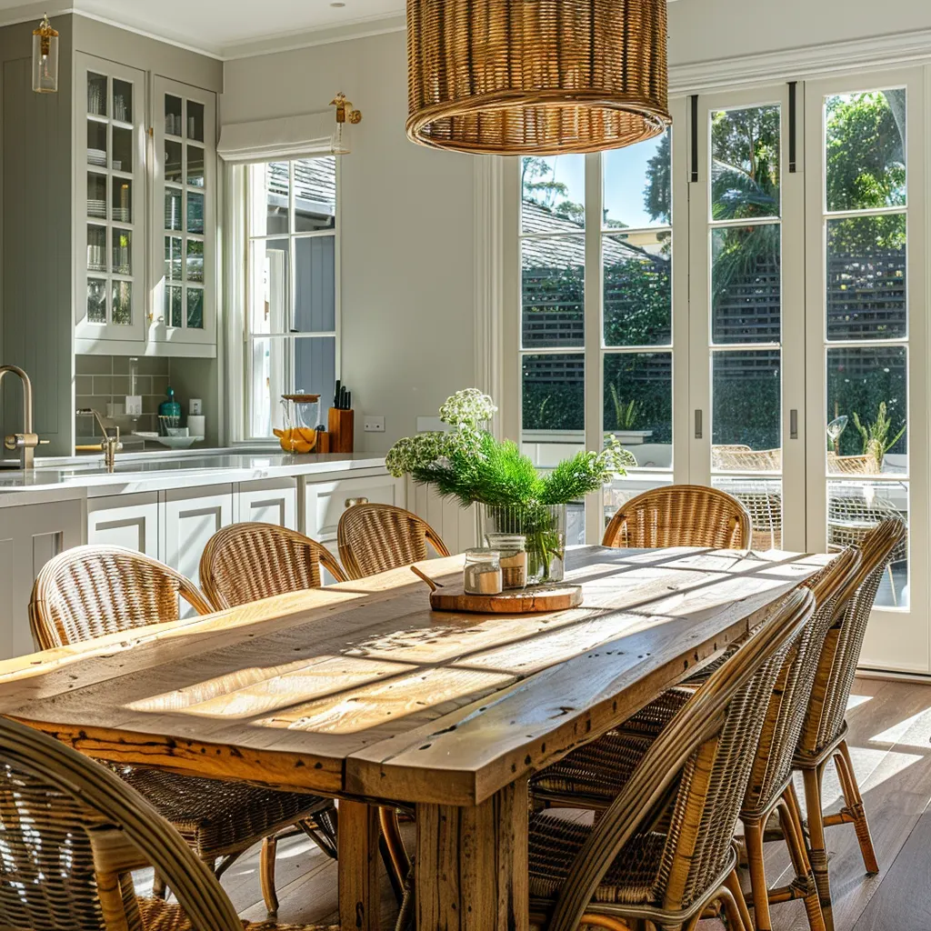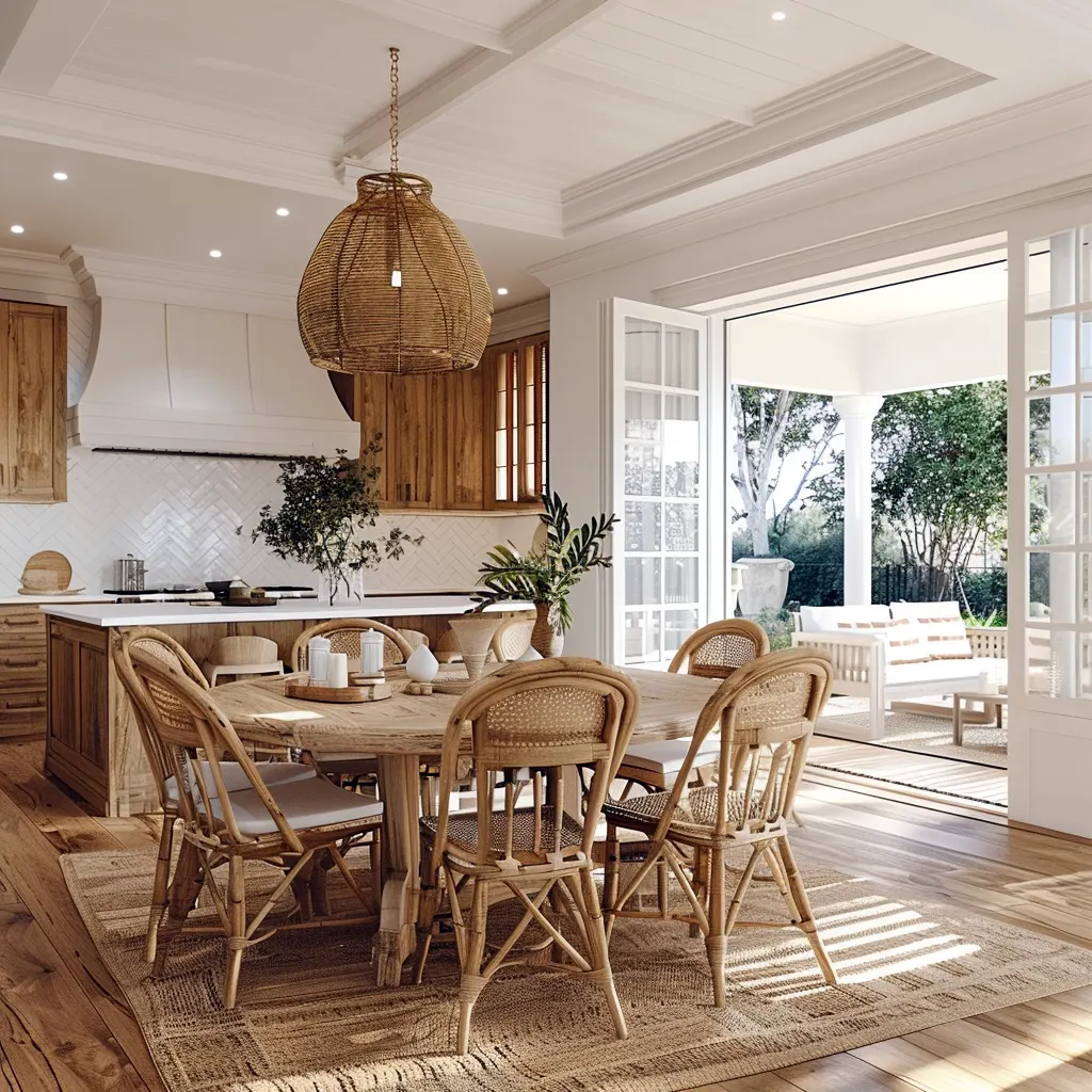 Zastosowanie rattanu i drewna w kuchni w stylu Hampton to więcej niż tylko dekoracyjny wybór — to decyzja, która wpływa na atmosferę całego domu, czyniąc kuchnię prawdziwym centrum życia rodzinnego. Te naturalne materiały przynoszą ze sobą nie tylko piękno i ciepło, ale także tworzą przestrzeń, która jest równocześnie elegancka i przytulna.