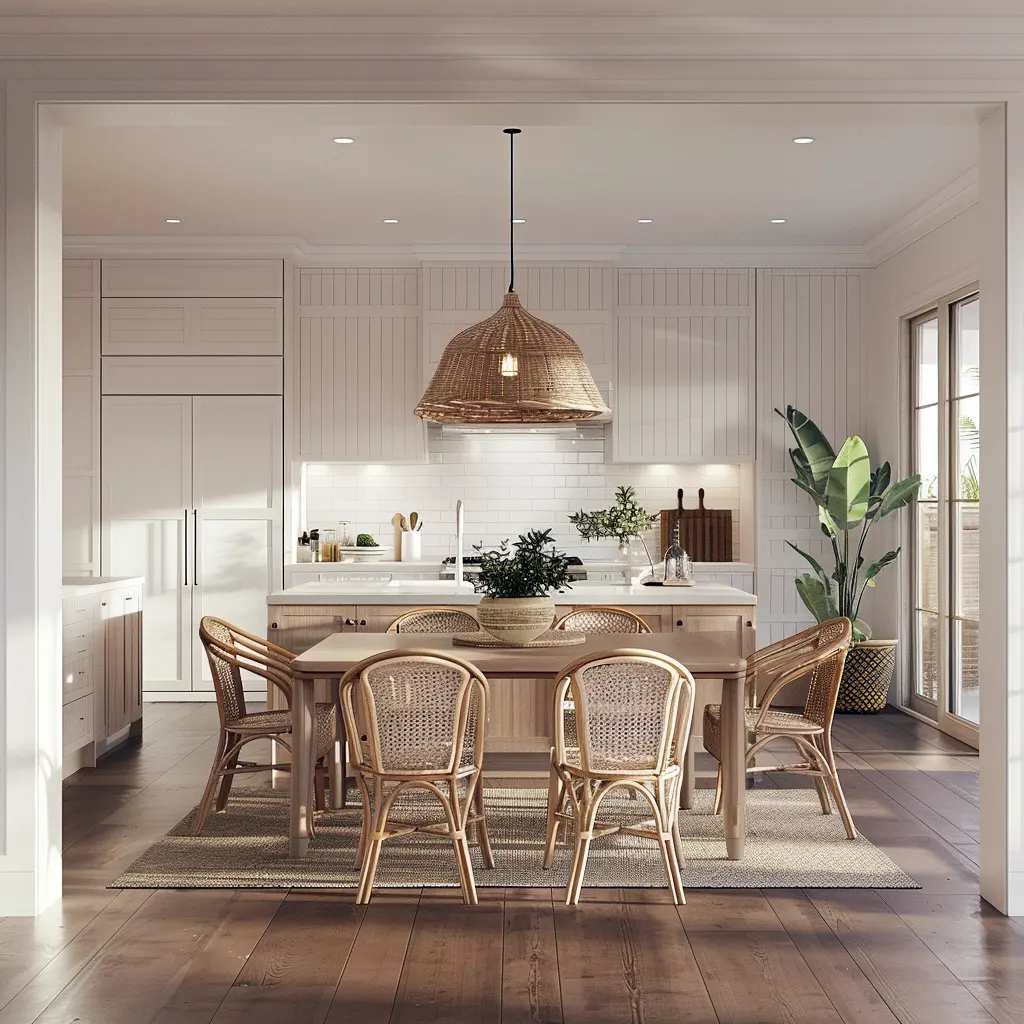 Styl Hampton kojarzy się z przestronnością, jasnością i elegancją, a sercem tego stylu jest zawsze kuchnia — miejsce, gdzie rodzina i przyjaciele zbierają się, by dzielić wspólne chwile. Wykorzystanie naturalnych materiałów, takich jak drewno i rattan, jest kluczowe dla stworzenia tej niepowtarzalnej atmosfery. Drewno zapewnia ciepło i trwałość, podczas gdy rattan wnosi elementy lekkości i oryginalności, które są tak pożądane w nowoczesnych aranżacjach wnętrz.