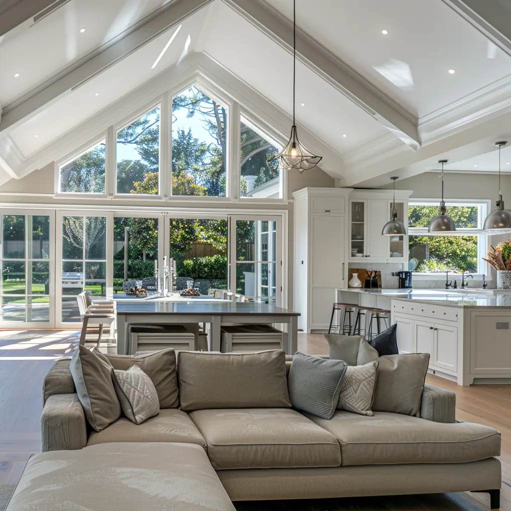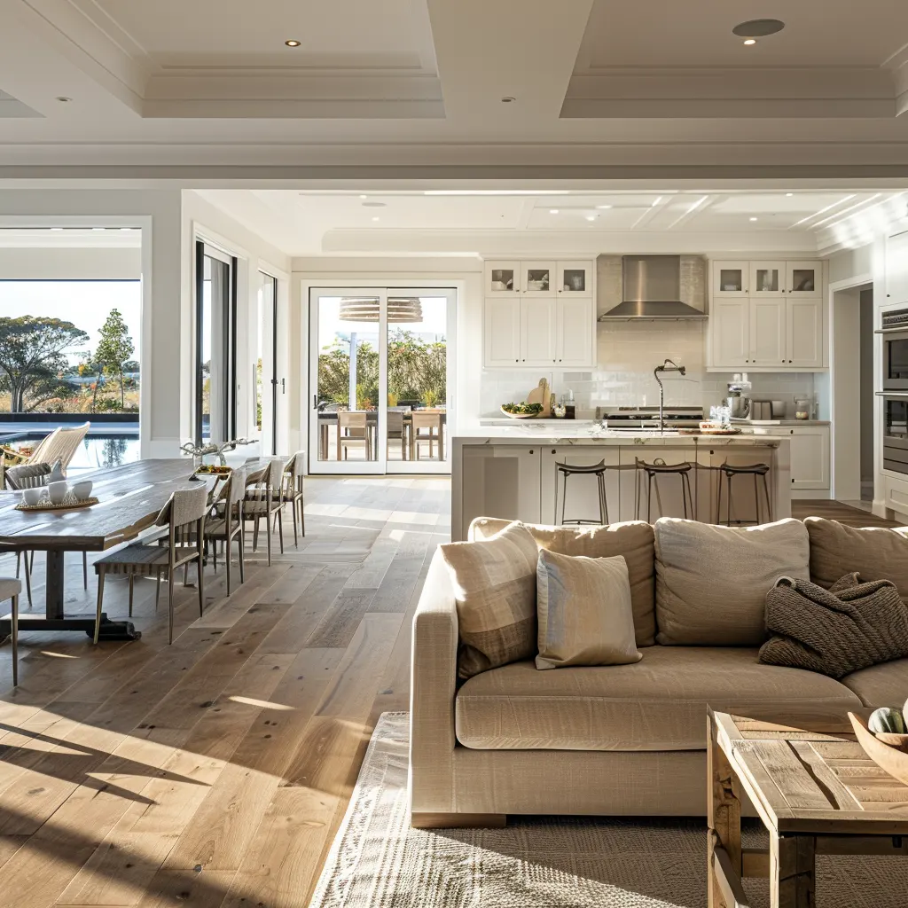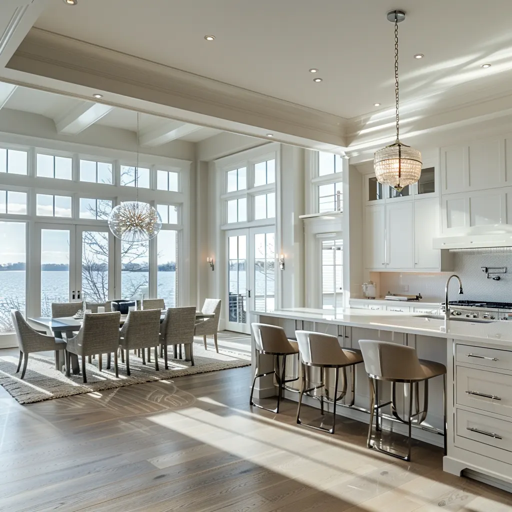 Styl Hampton charakteryzuje się przestronnością i jasnością, gdzie dominują neutralne kolory przełamane delikatnymi odcieniami błękitu i zieleni, przypominającymi morską bryzę i letnie niebo. Kluczowe jest użycie naturalnych materiałów – drewno, kamień i lniane tkaniny dodają wnętrzu ciepła i autentyczności. Duże okna nie tylko wpuszczają do wnętrza obfitość naturalnego światła, ale także umożliwiają cieszenie się widokiem na otoczenie, co jest istotą nadmorskiego stylu. Nie można zapomnieć o eleganckich, ozdobnych listwach i detalach architektonicznych, które są subtelnym, ale wyrafinowanym akcentem dekoracyjnym.