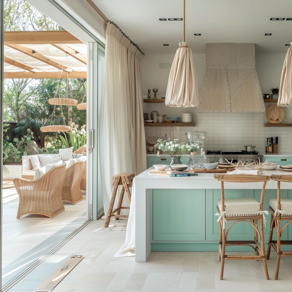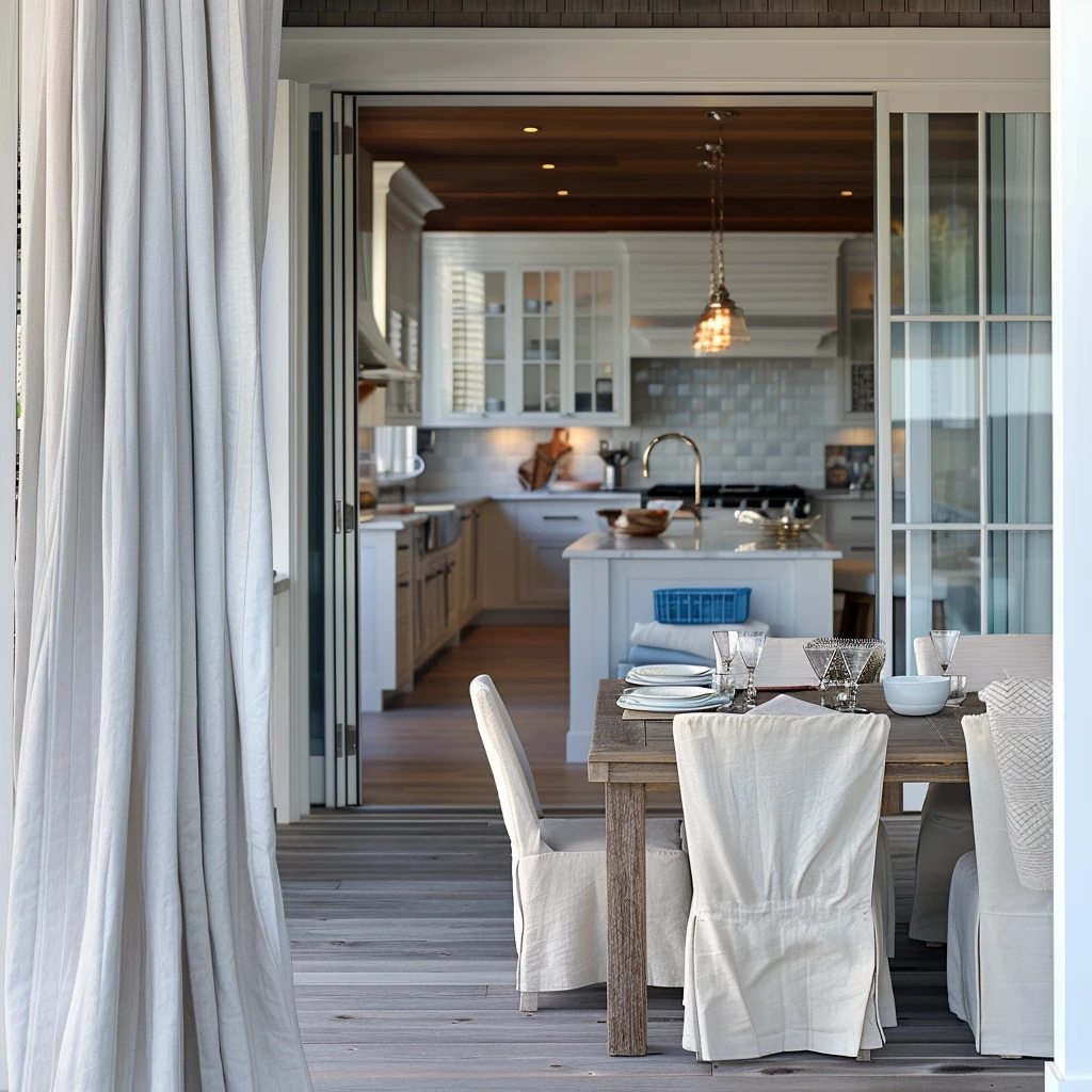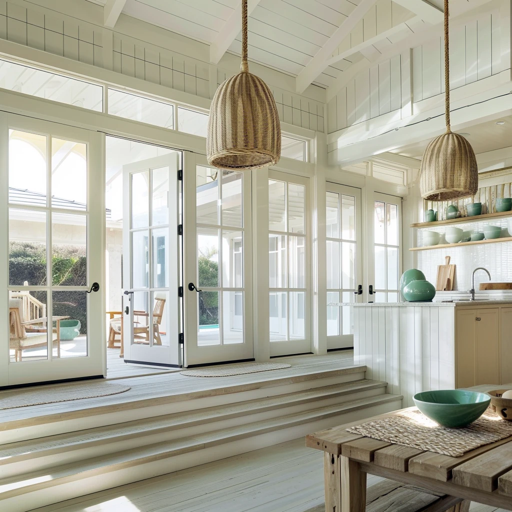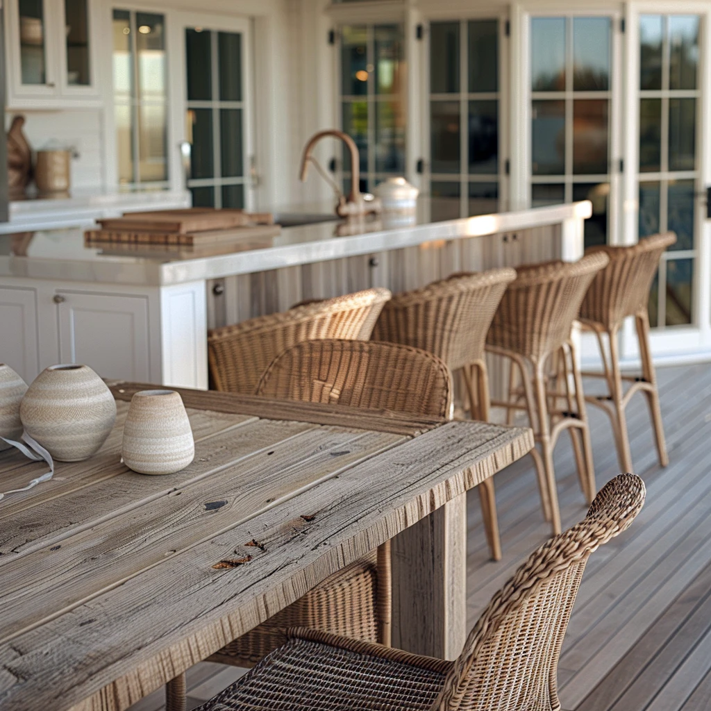 Styl Hampton wyróżnia się wykorzystaniem naturalnych surowców, które wprowadzają do wnętrz ciepło, teksturę i autentyczność. Drewno, wiklina, rattan, len, bawełna czy lniane tkaniny – wszystkie te materiały nawiązują do nadmorskiego klimatu i naturalnego otoczenia. W przestrzeniach łączących kuchnię z tarasem czy werandą, te naturalne elementy nabierają szczególnego znaczenia, stanowiąc pomost między domem a ogrodem.