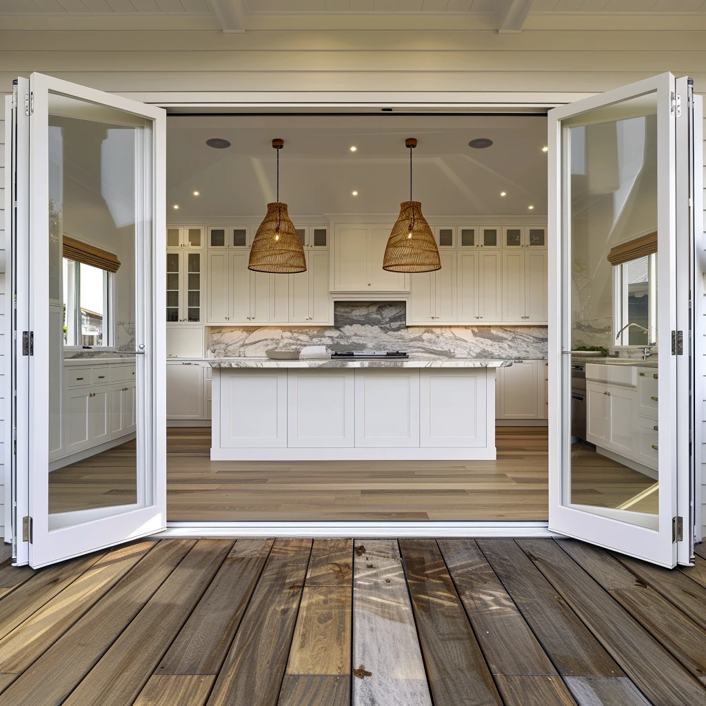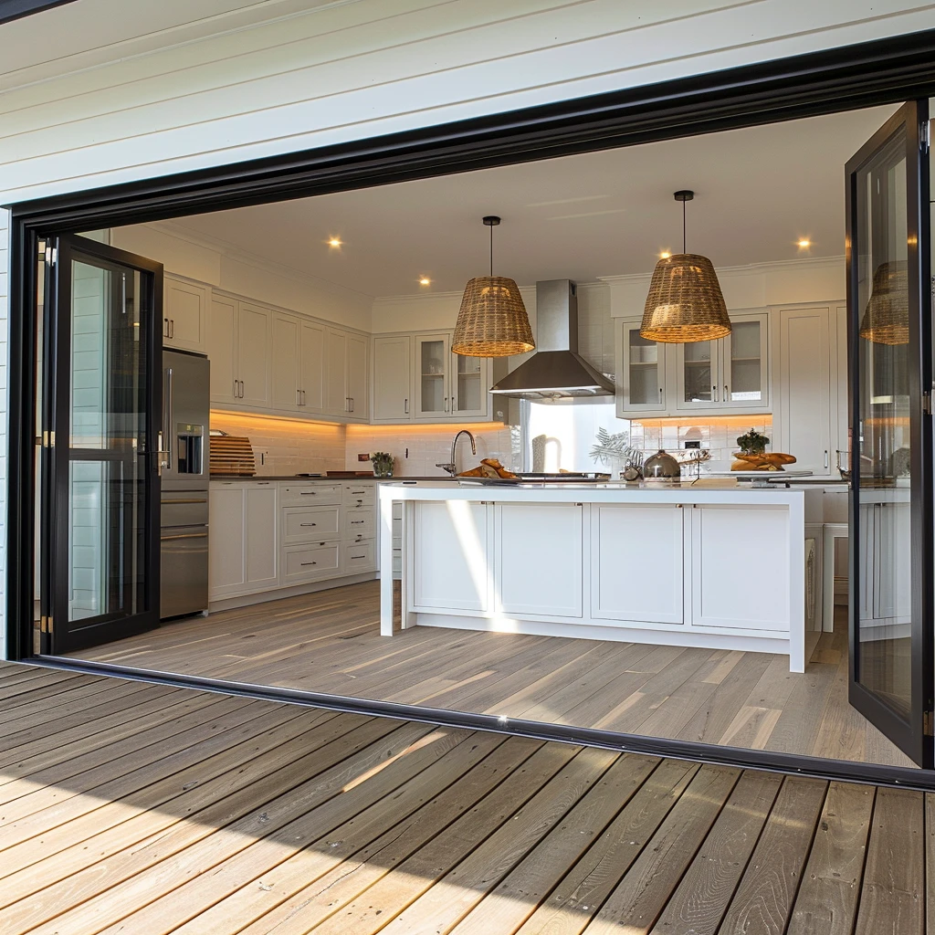 Przede wszystkim, należy rozważyć instalację obszernych przeszkleń w postaci przesuwnych drzwi tarasowych lub składanych systemów drzwiowych typu harmonijkowego. Takie rozwiązania pozwalają na całkowite otwarcie przestrzeni w ciepłe dni, dosłownie eliminując barierę między kuchnią a tarasem. W chłodniejsze miesiące natomiast umożliwiają wizualne połączenie obu stref przy zachowaniu komfortu termicznego.