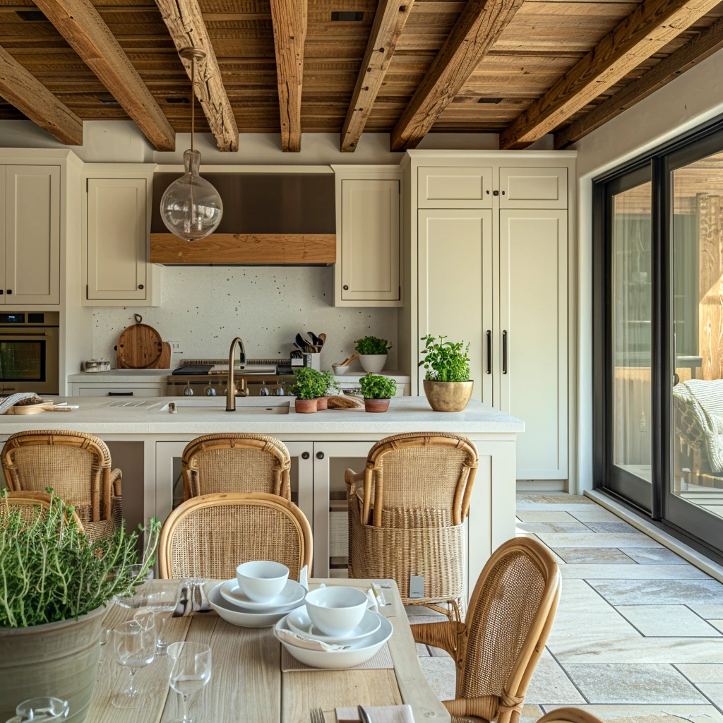 Meble ogrodowe z rattanu, wiklinowe kosze czy linowe detale na tarasie będą korespondować z podobnymi elementami we wnętrzu – ratanowymi hokerami przy wyspie kuchennej, wiklinowymi koszami na pieczywo czy linowymi detalami lamp i dekoracji. Dzięki temu przestrzeń zewnętrzna stanie się naturalnym przedłużeniem kuchni, zachowując spójność stylistyczną.