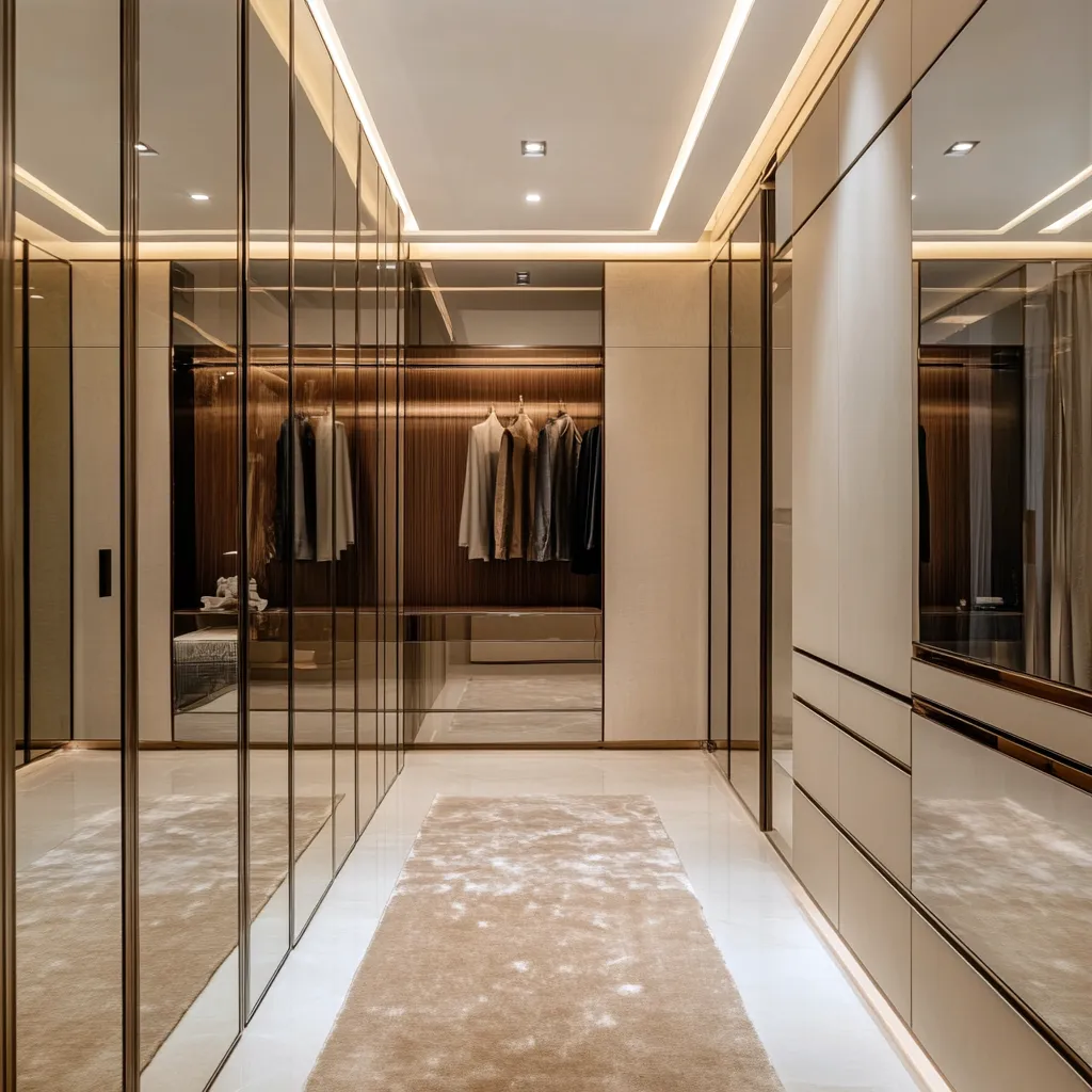 Jeśli chodzi o materiały wykończeniowe, w nowoczesnej garderobie stawiamy na kontrasty faktur. Szkło, metal, lakierowane powierzchnie zestawione z matowymi wykończeniami czy naturalnymi akcentami drewna dodają wnętrzu głębi i charakteru. Wzory, jeśli się pojawiają, powinny być subtelne – delikatne geometryczne motywy czy linearne desenie. To właśnie te elementy, w połączeniu z lustrzanymi powierzchniami, tworzą wyjątkowy charakter garderoby.