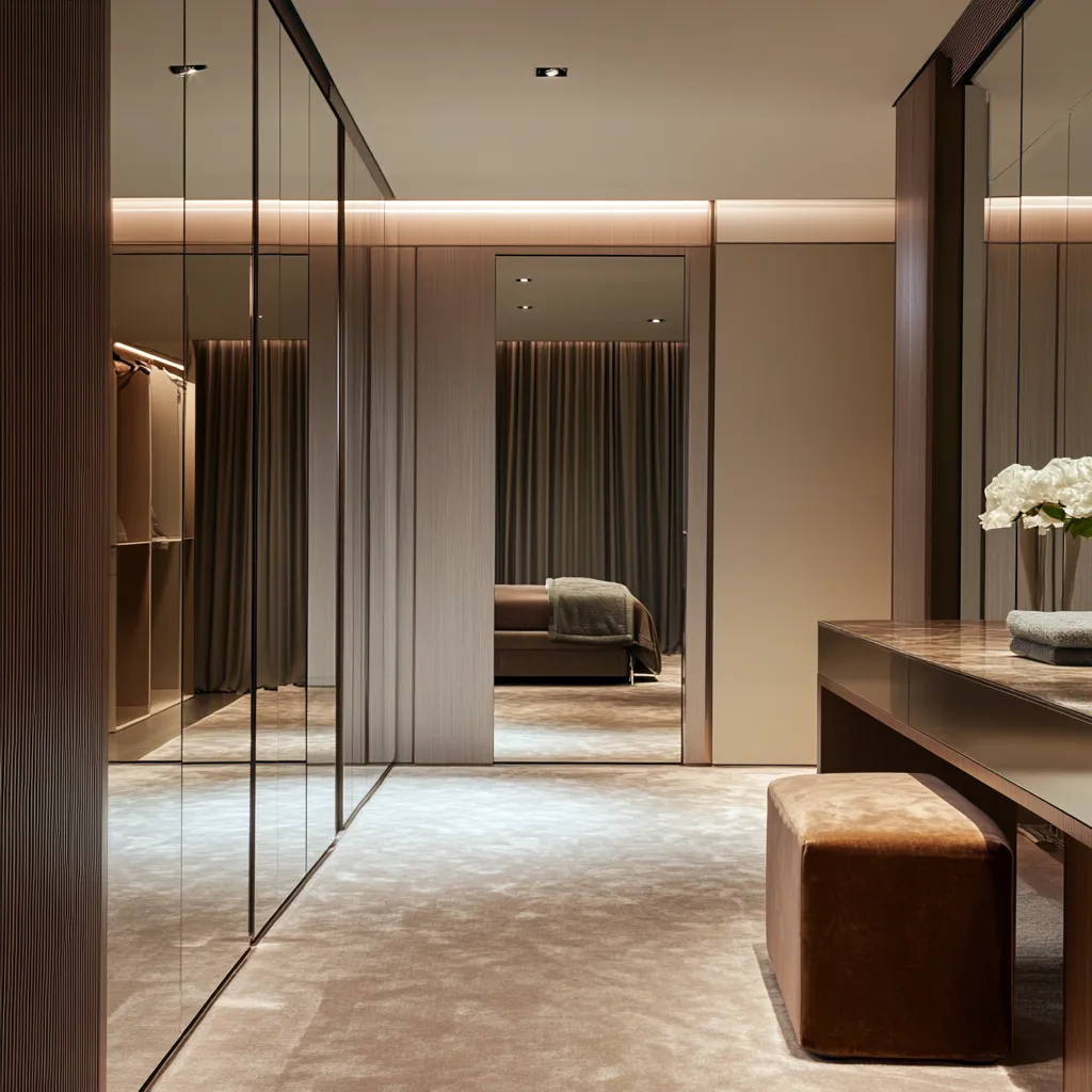 Jeśli chodzi o materiały wykończeniowe, w nowoczesnej garderobie stawiamy na kontrasty faktur. Szkło, metal, lakierowane powierzchnie zestawione z matowymi wykończeniami czy naturalnymi akcentami drewna dodają wnętrzu głębi i charakteru. Wzory, jeśli się pojawiają, powinny być subtelne – delikatne geometryczne motywy czy linearne desenie. To właśnie te elementy, w połączeniu z lustrzanymi powierzchniami, tworzą wyjątkowy charakter garderoby.