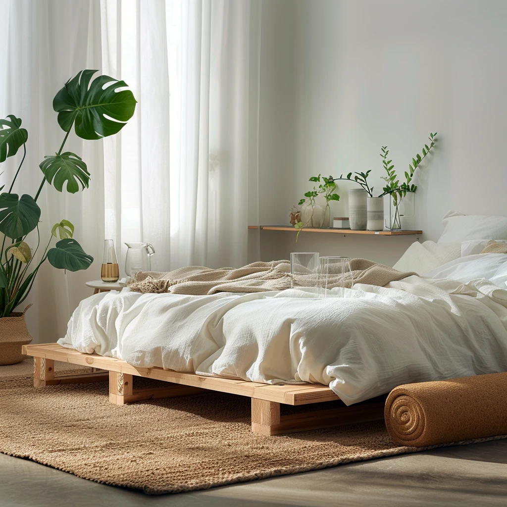 Drewniane łóżko z prostym, minimalistycznym zagłówkiem może stanowić centralny punkt sypialni. Warto zwrócić uwagę na meble o prostych, czystych liniach, bez zbędnych zdobień czy ornamentów. Komoda, szafa czy stoliki nocne z jasnego drewna będą doskonale komponować się z całością, tworząc spójną aranżację.