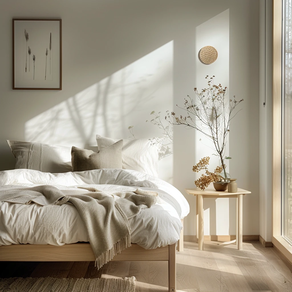 Nie oznacza to jednak, że sypialnia ma być pozbawiona charakteru. Wręcz przeciwnie – starannie dobrane dodatki, takie jak grafiki w drewnianych ramach, ceramiczne wazony z gałązkami czy naturalne dekoracje, mogą nadać wnętrzu indywidualny wyraz, pozostając w zgodzie z minimalistycznym duchem stylu skandynawskiego.