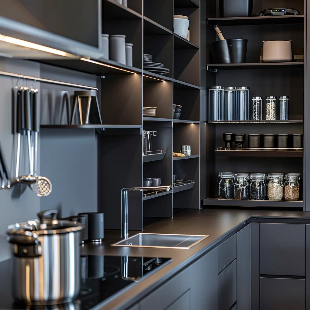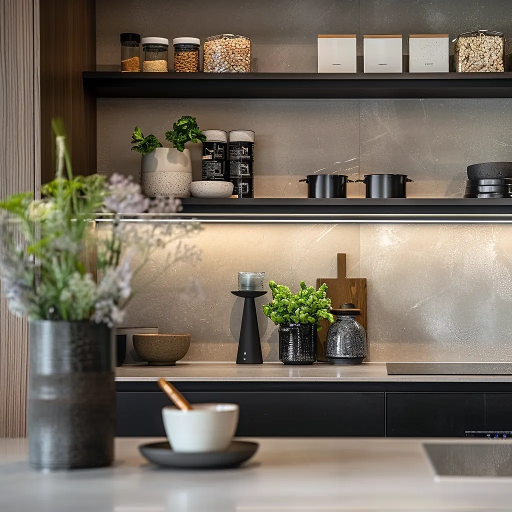 Otwarte półki zdobywają coraz większą popularność w nowoczesnych projektach kuchennych. Ich główną zaletą jest możliwość eksponowania pięknych naczyń, książek kulinarnych czy dekoracji, co dodaje wnętrzu charakteru i osobistego stylu. Taka aranżacja sprzyja również większej przejrzystości i sprawia, że potrzebne przedmioty są zawsze pod ręką.