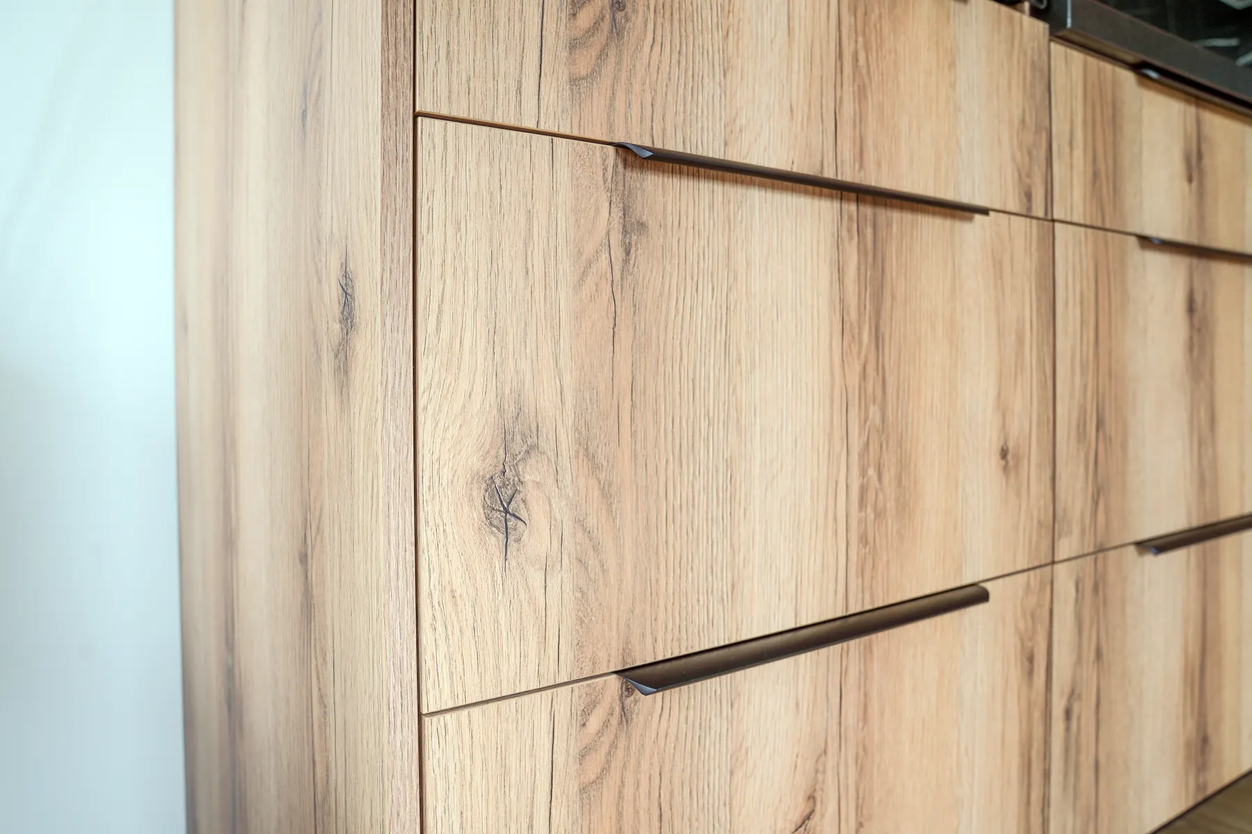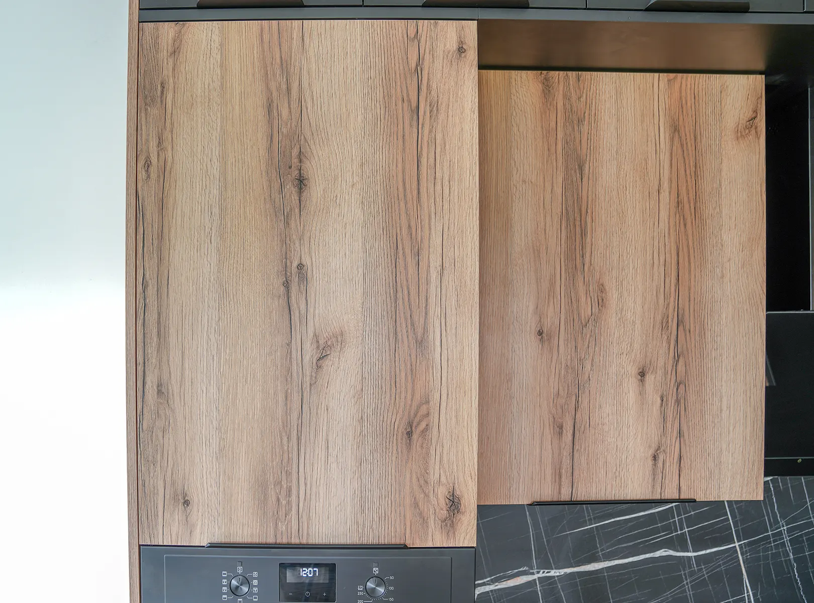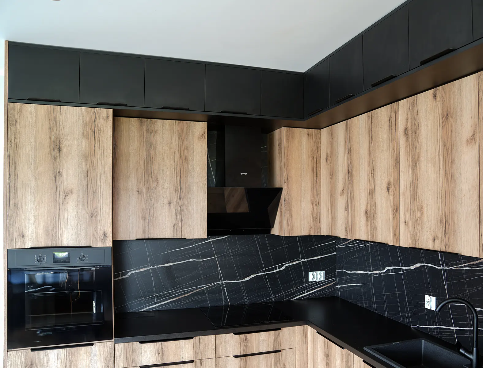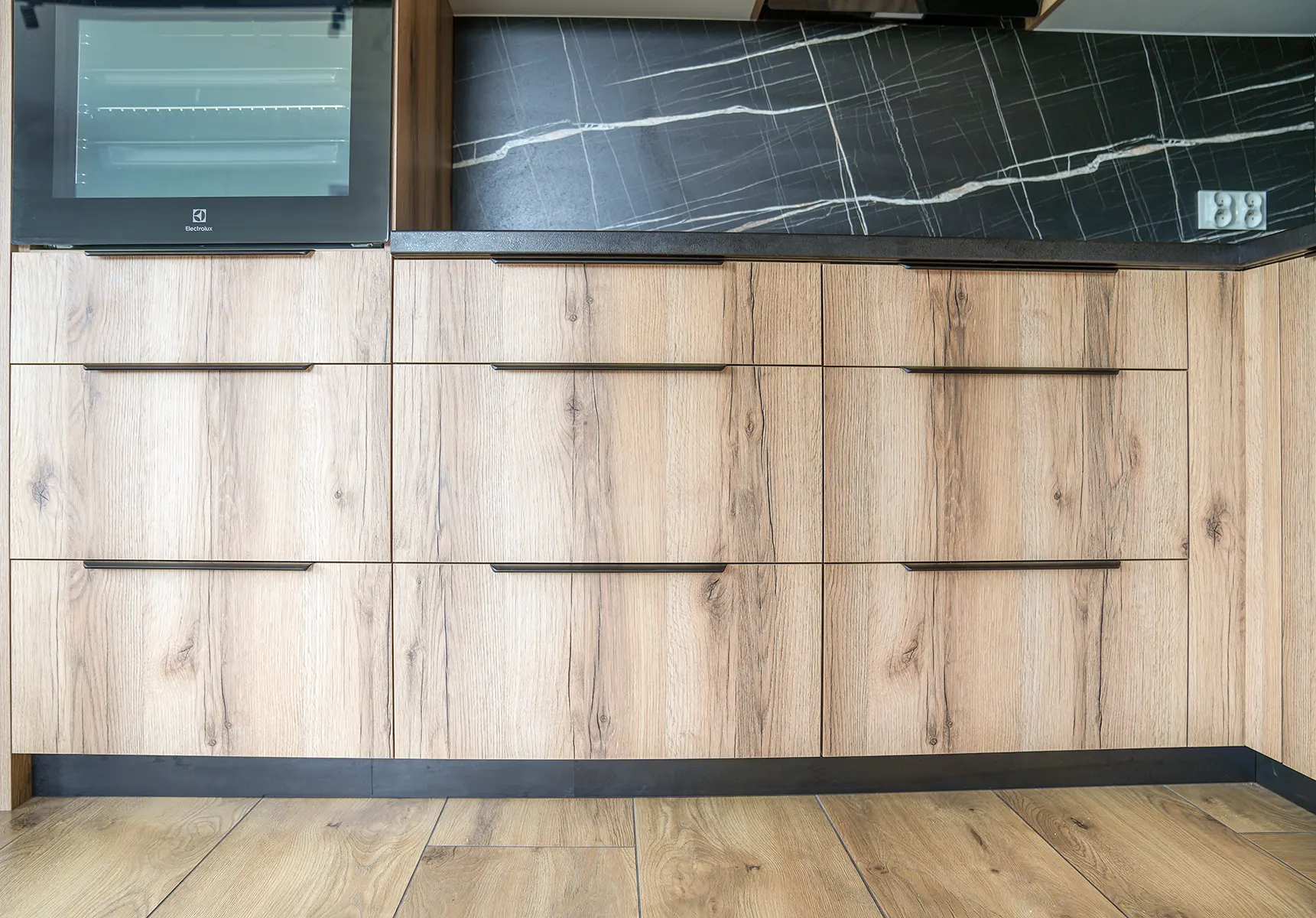 Szczególną uwagę zwrócono na detale i materiały wykończeniowe. Fronty wykonane z dębu lungo dodają całości wyrazistości i ciepła, stanowiąc doskonałe tło dla nowoczesnych sprzętów kuchennych. Przestrzeń międzyszafkowa wyłożona jest marmurem sachara, który doskonale komponuje się z kolorystyką blatu, tworząc spójny i estetyczny wygląd.