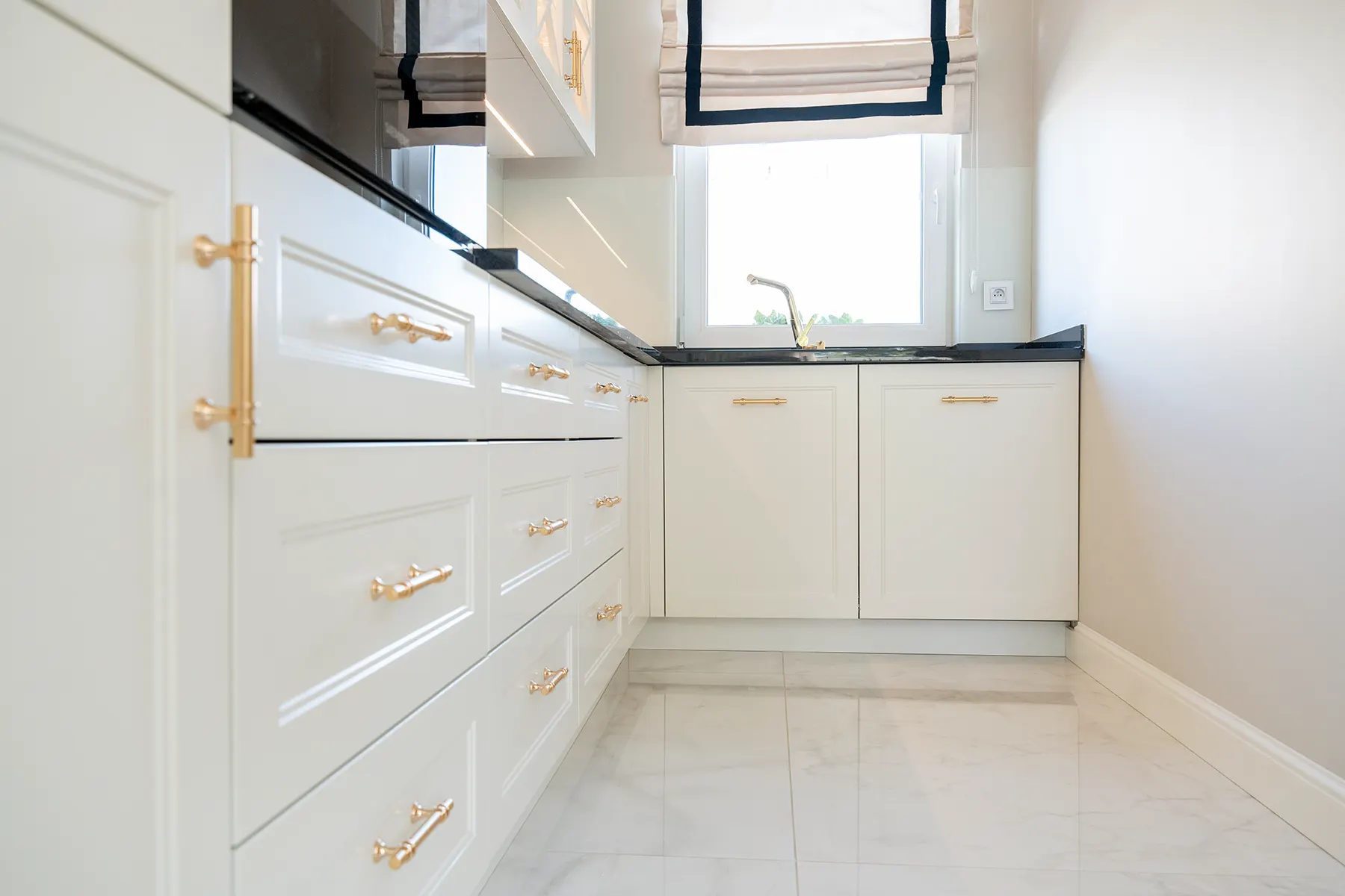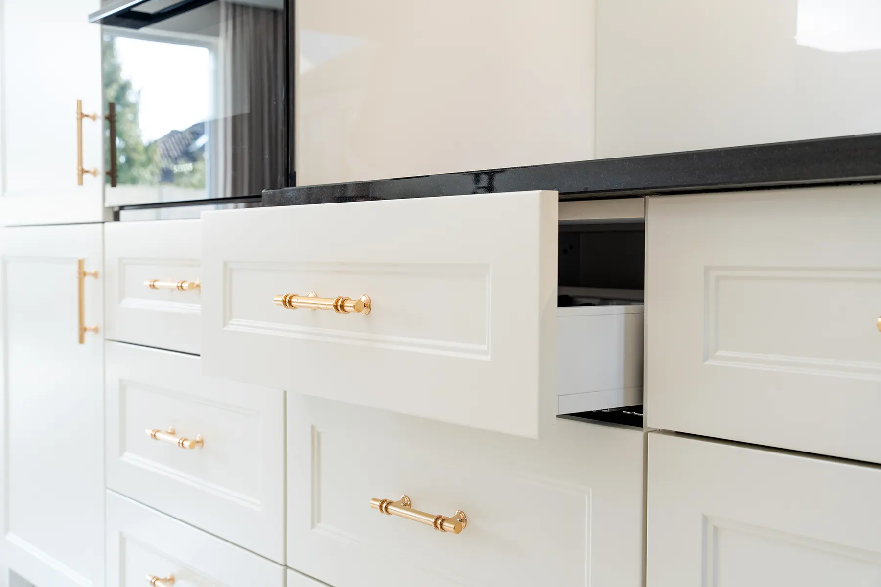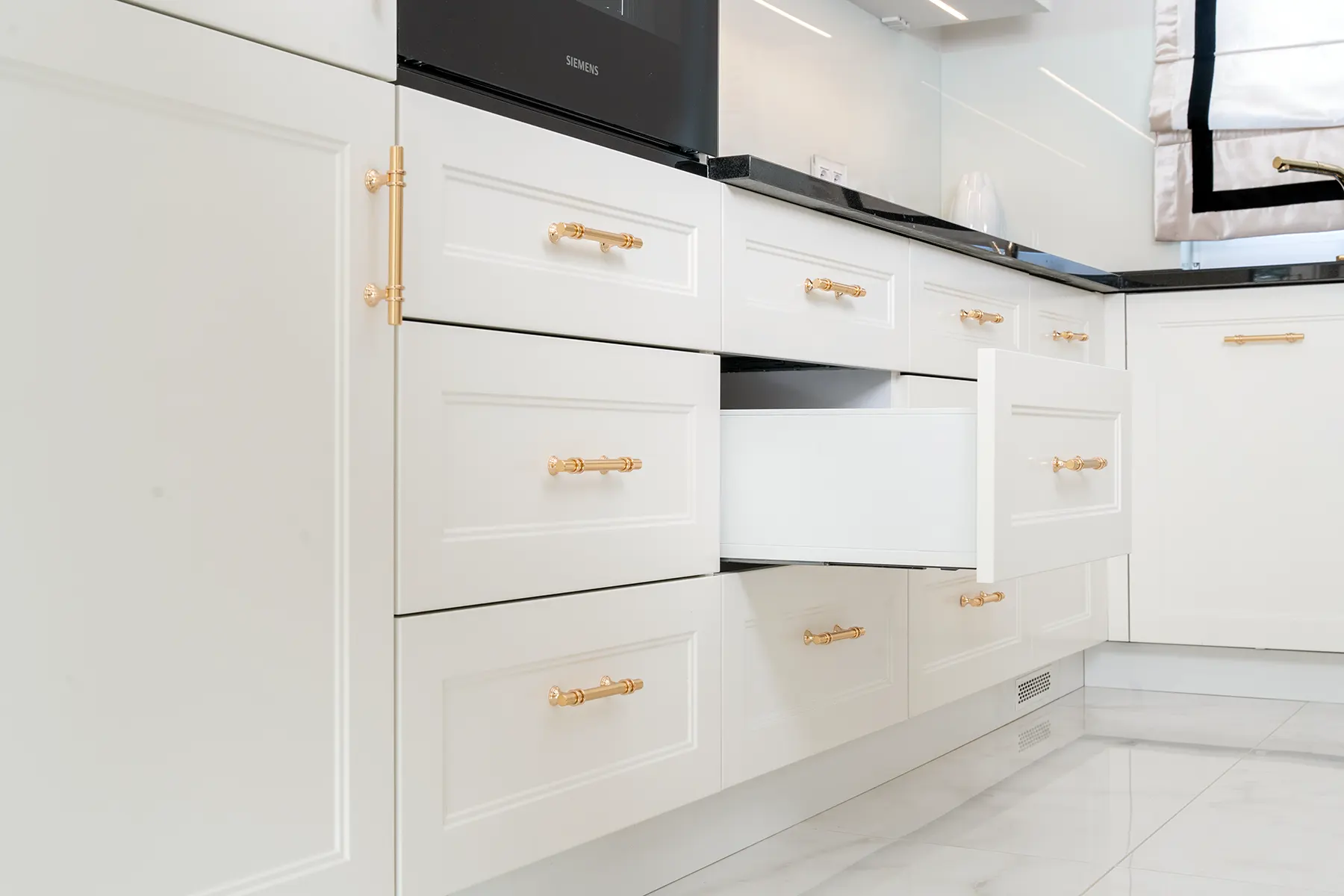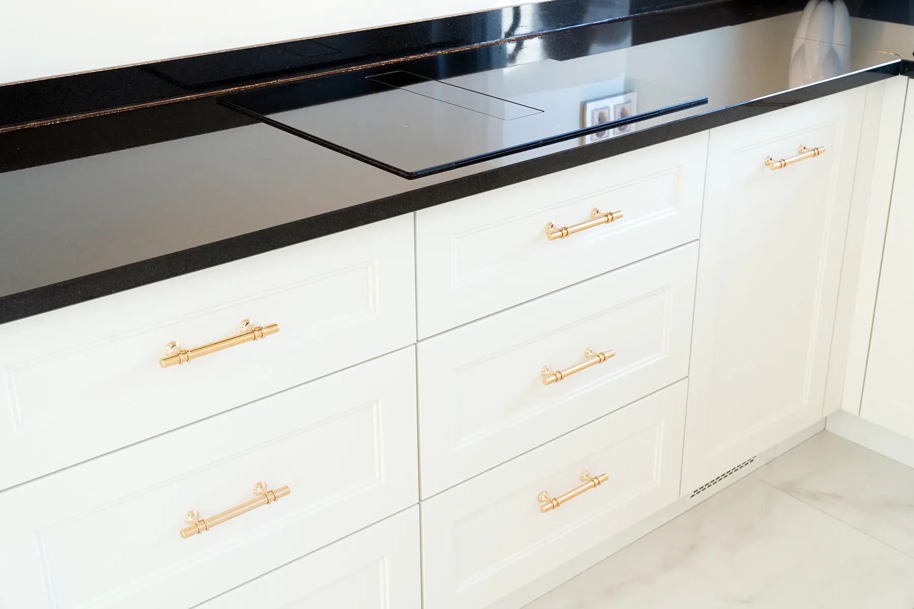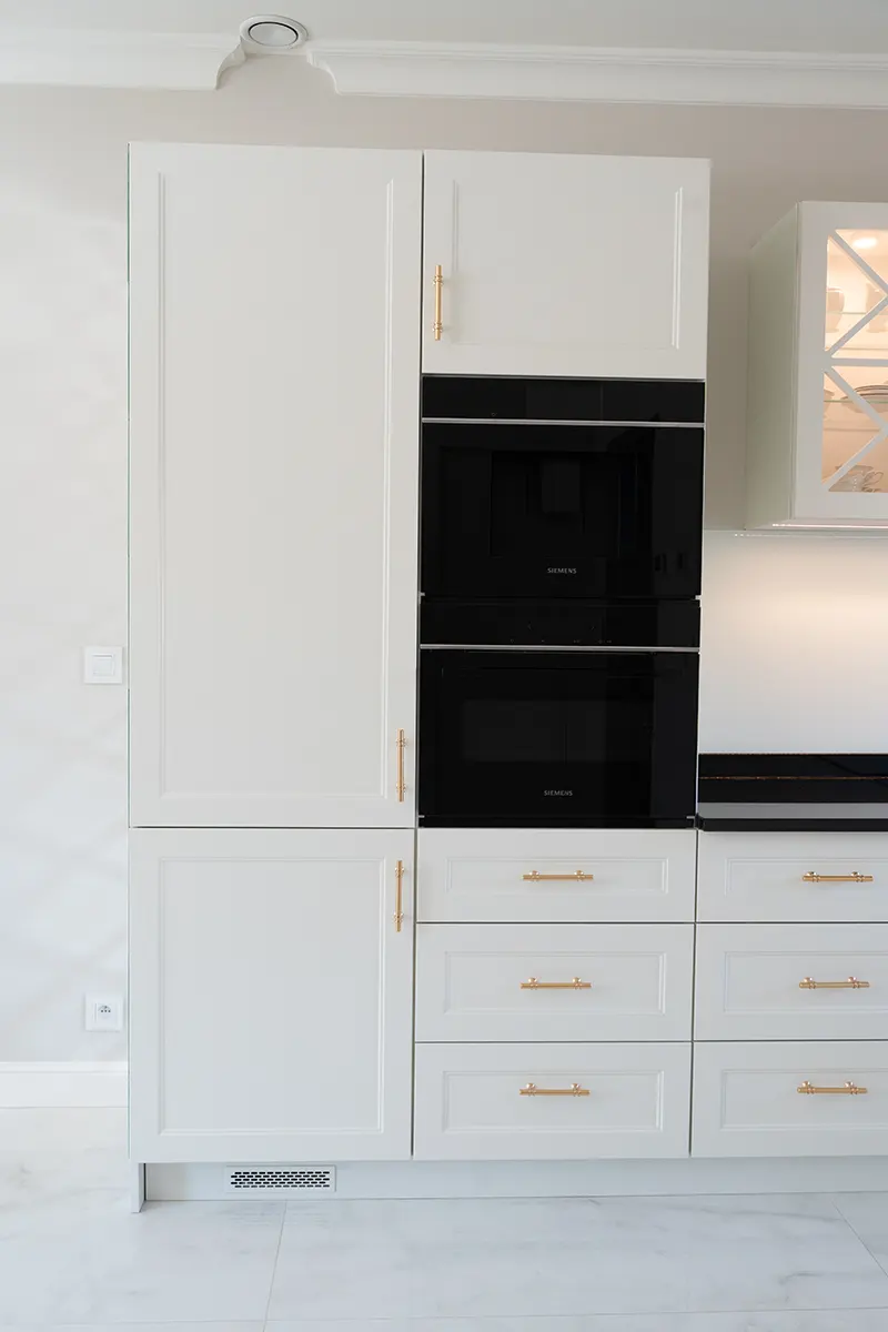 Fronty meblowe wykonane w odcieniu przełamanej bieli dodają wnętrzu lekkości i subtelnego szyku. Stanowią one idealne tło dla głównego punktu kuchni – imponującego blatu z granitu „Galaxy Star”. Jego głęboki czarny kolor z delikatnymi błyskami przywodzi na myśl rozgwieżdżone niebo, dodając wnętrzu głębi i charakteru.