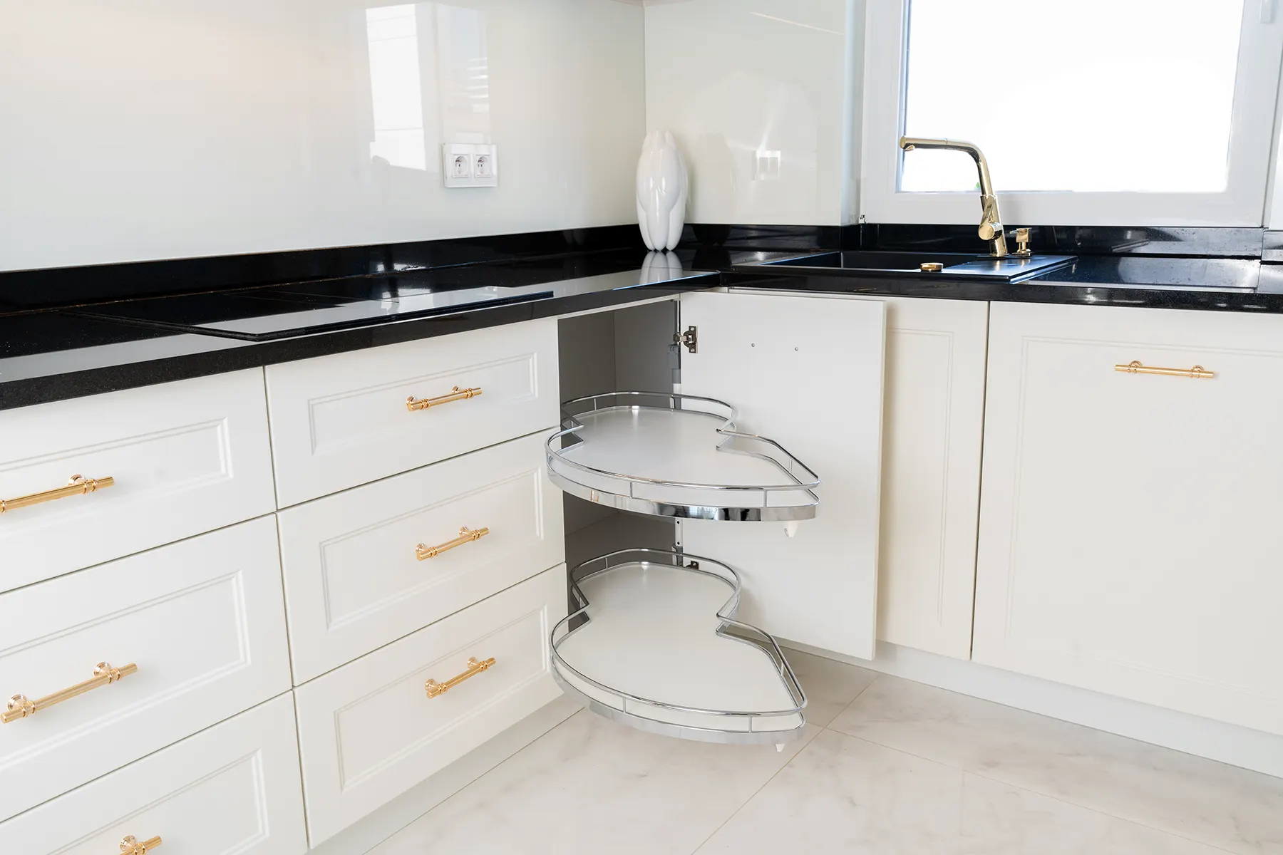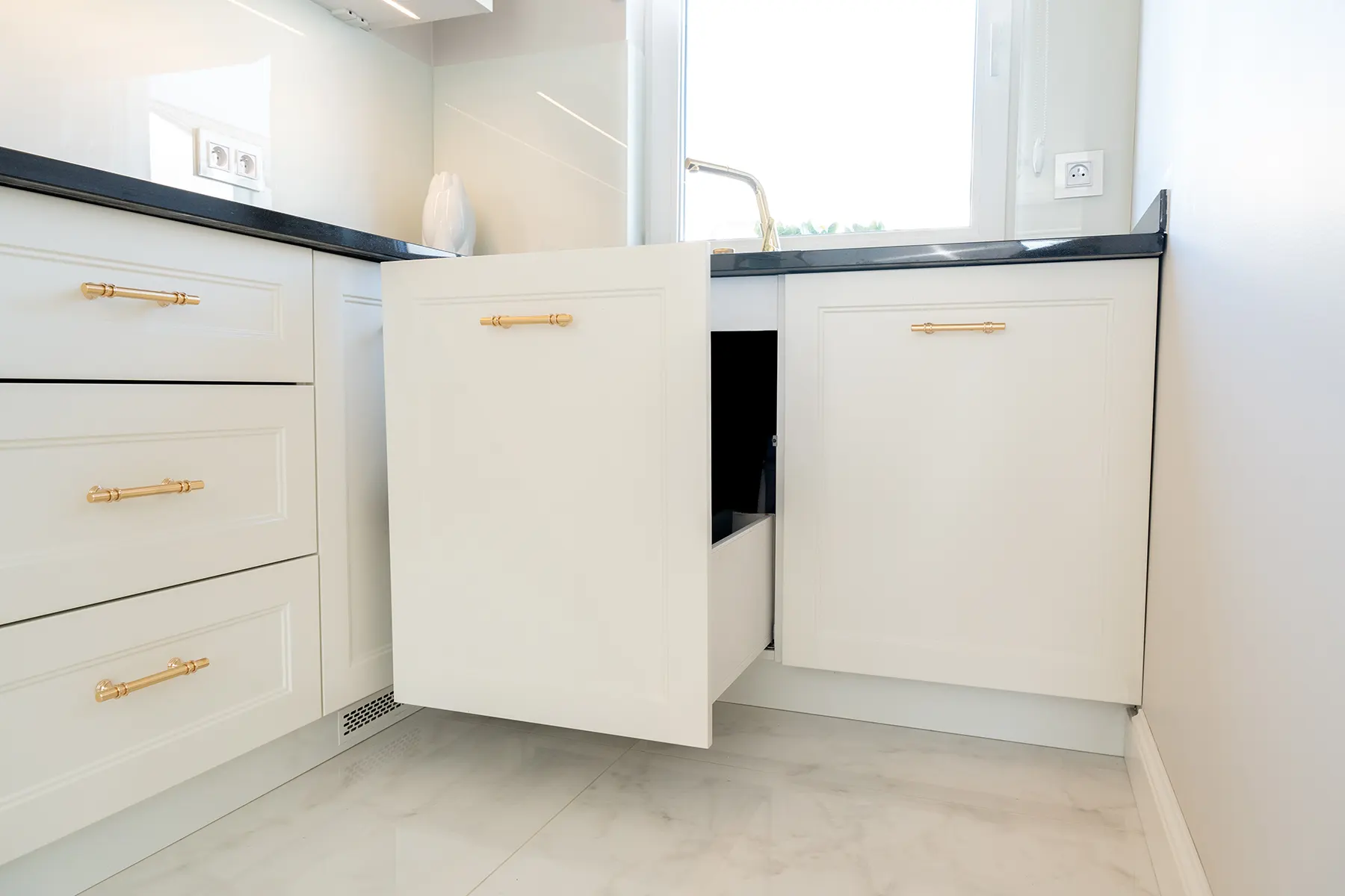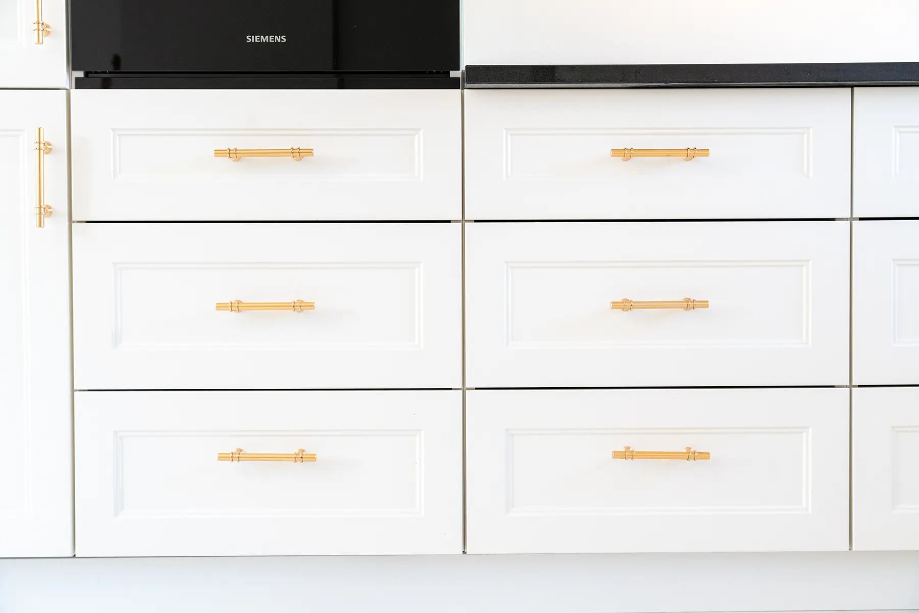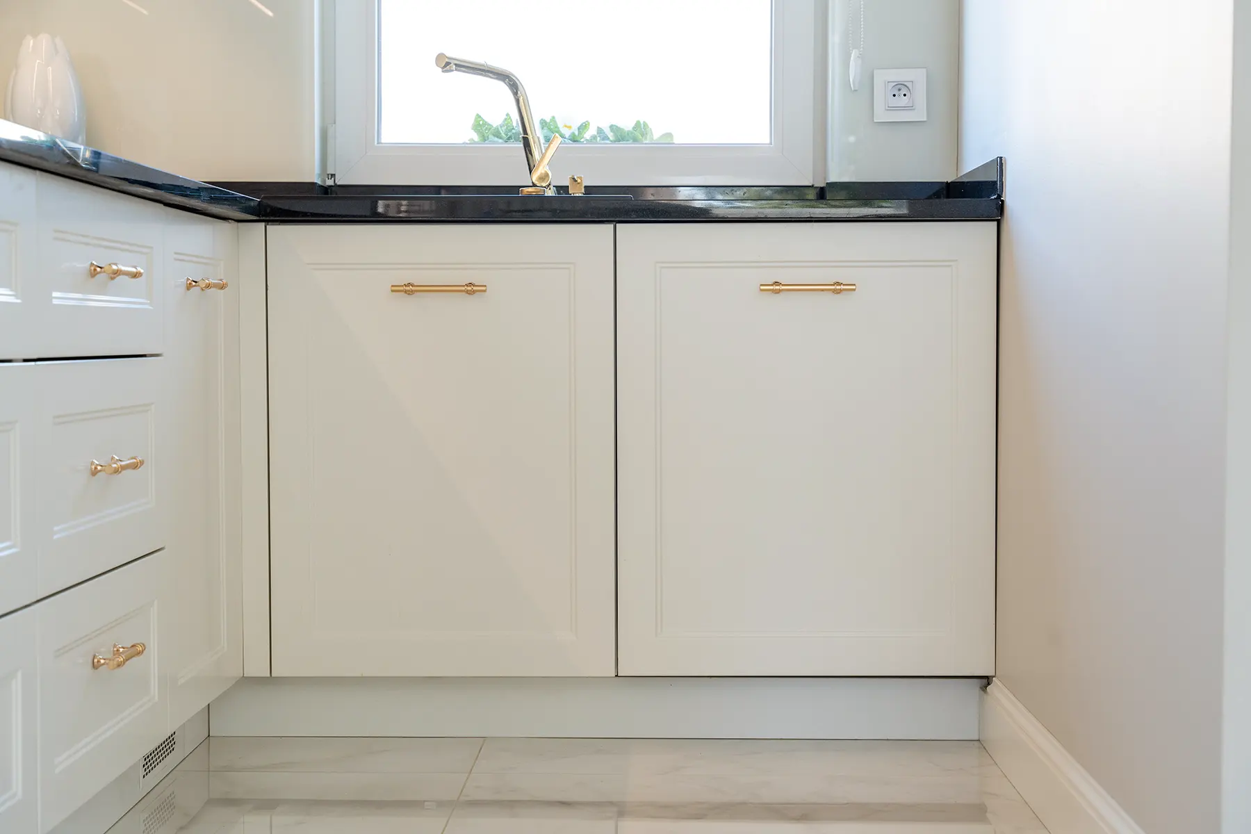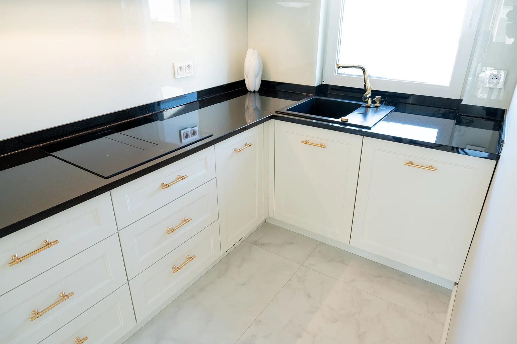 Fronty meblowe wykonane w odcieniu przełamanej bieli dodają wnętrzu lekkości i subtelnego szyku. Stanowią one idealne tło dla głównego punktu kuchni – imponującego blatu z granitu „Galaxy Star”. Jego głęboki czarny kolor z delikatnymi błyskami przywodzi na myśl rozgwieżdżone niebo, dodając wnętrzu głębi i charakteru.