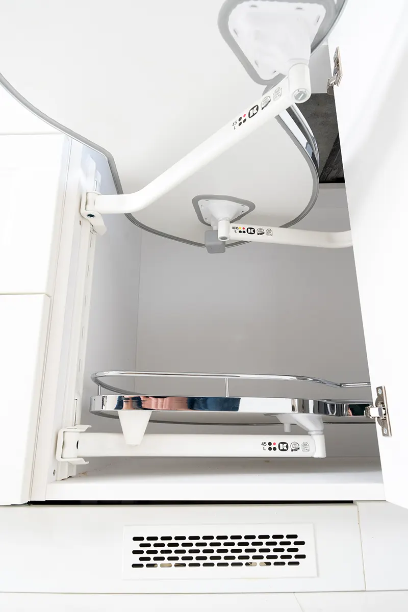 Dodatkowy połysk wnosi lakierowane wykończenie frontów, które nie tylko pięknie się prezentują, ale są również wyjątkowo praktyczne w codziennym użytkowaniu. Zintegrowany okap w płycie gwarantuje, że nowoczesne technologie mogą współgrać z elegancją, pozwalając na utrzymanie czystości i porządku bez zbędnych kompromisów.