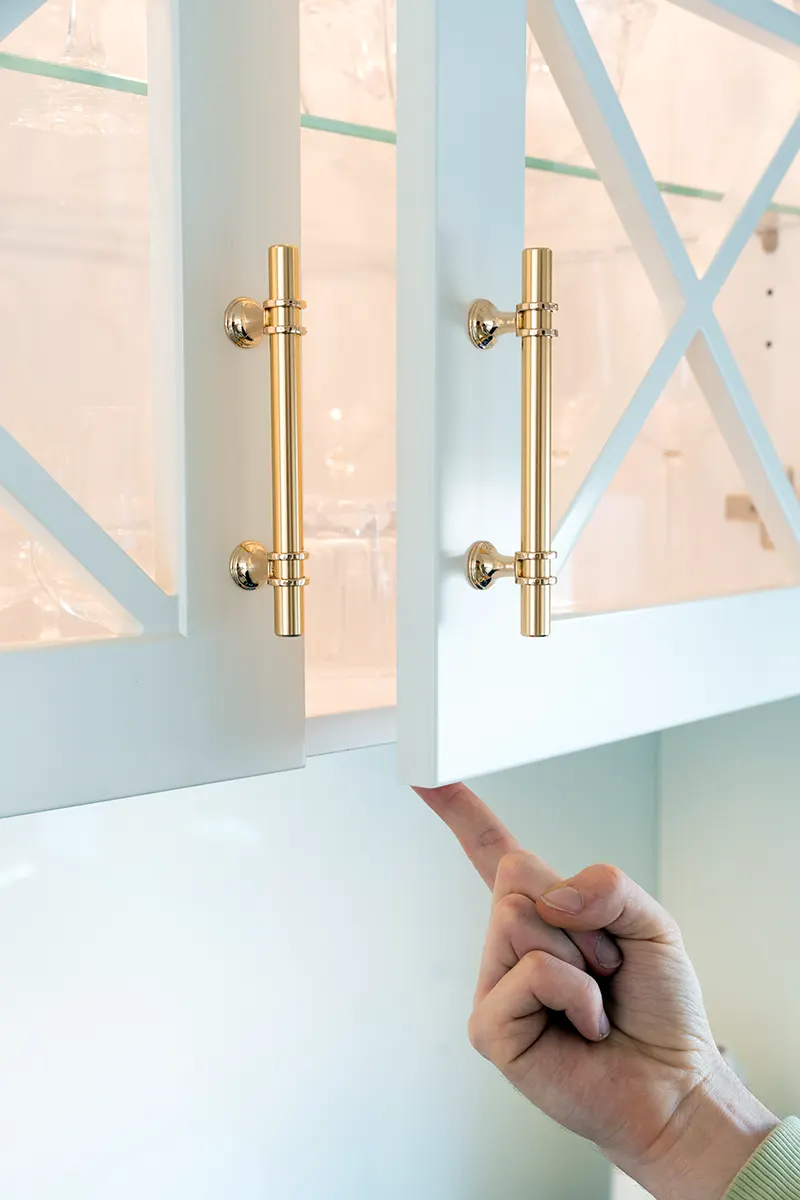 Projekt dopełnia lustro w stylu Caro, umieszczone strategicznie w kuchni. Jest to charakterystyczny element dla stylu Glamour, który rozświetla przestrzeń, tworząc iluzję większego wnętrza, a jednocześnie odbijając światło i dodając wnętrzu dodatkowego blasku.