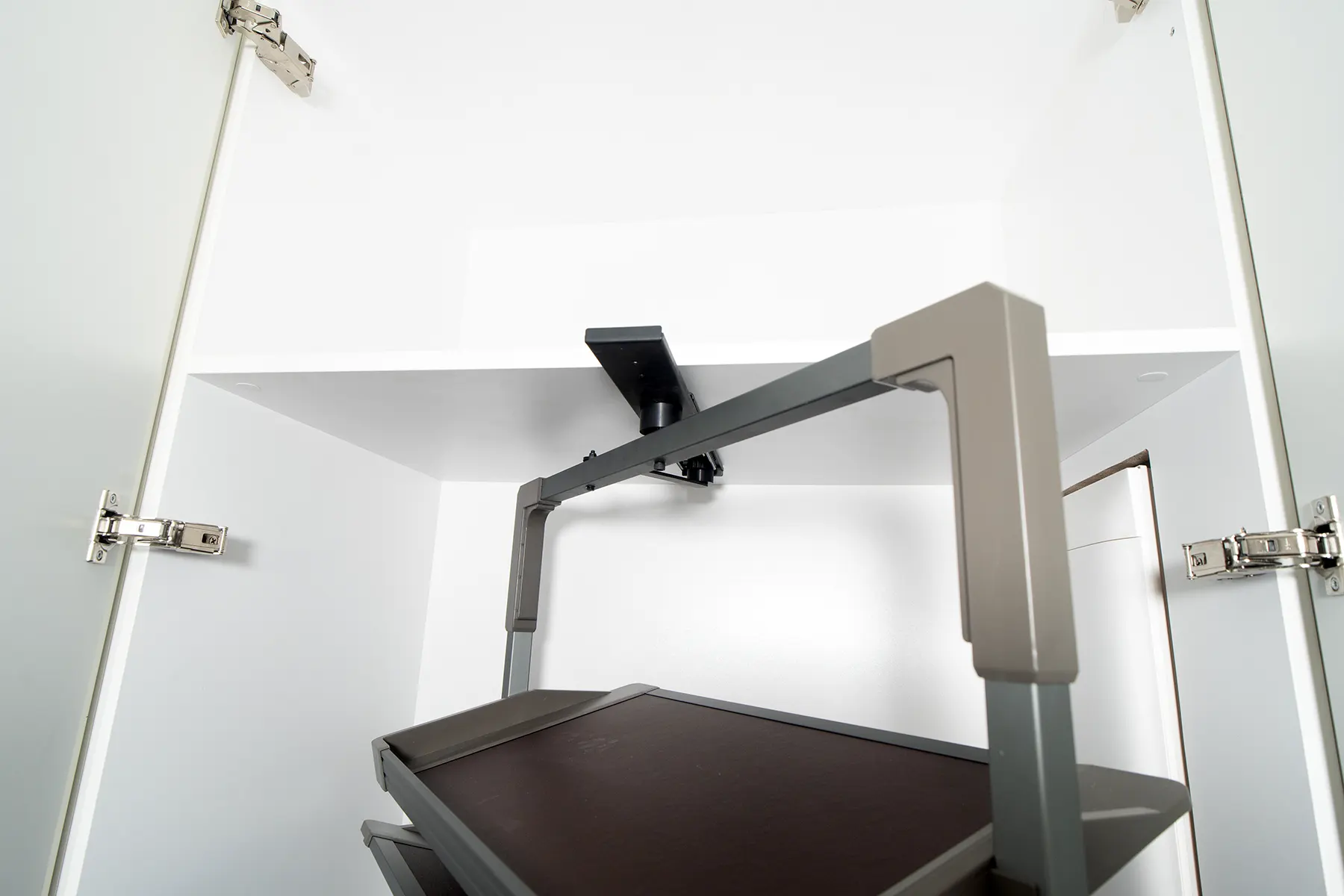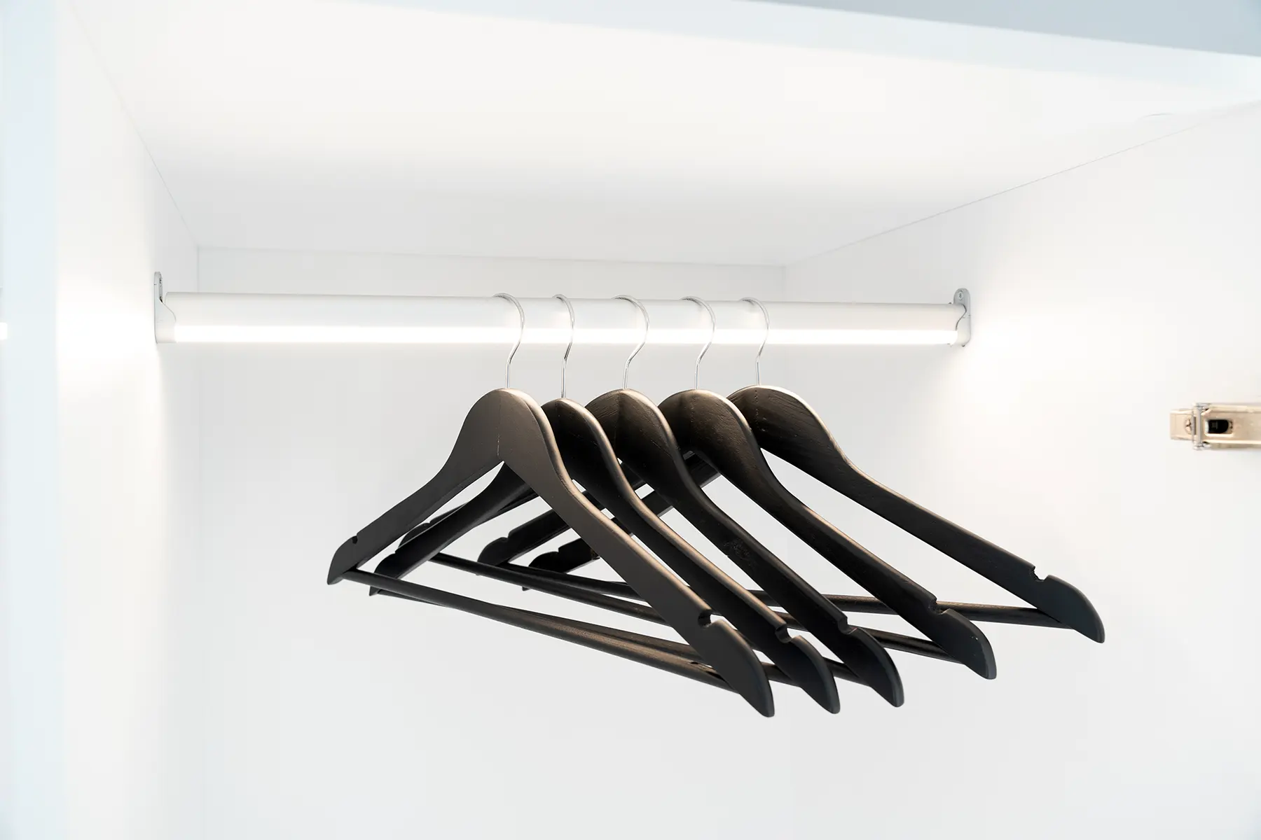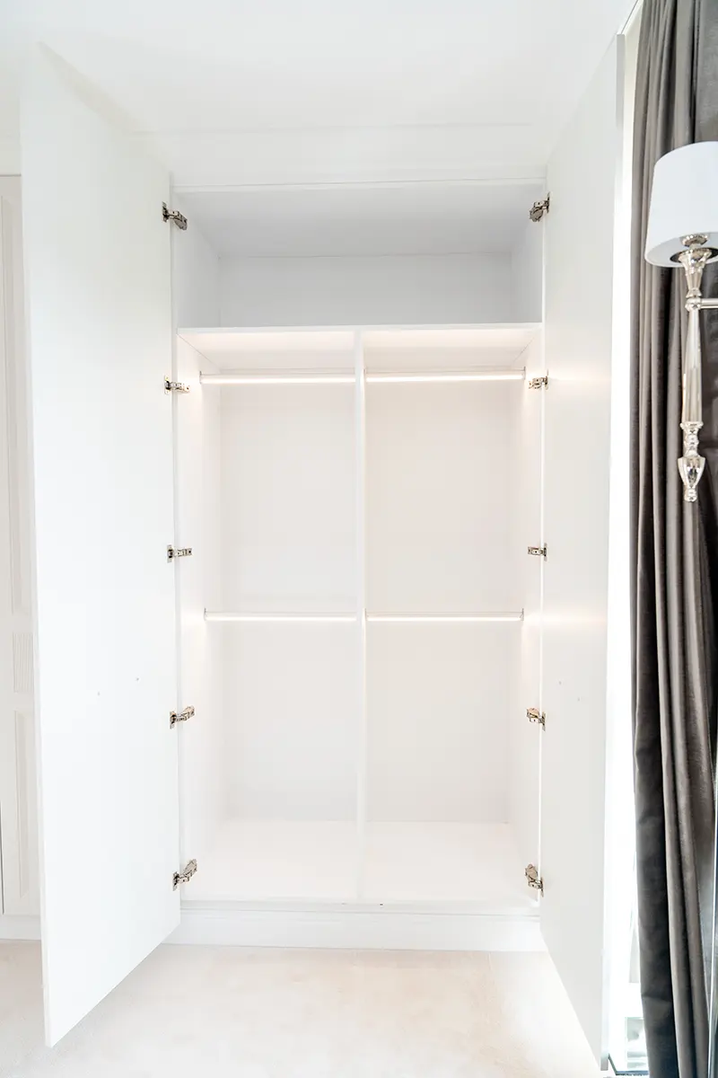 Z myślą o miłośnikach porządku i funkcjonalnych rozwiązań, zaprojektowaliśmy szereg innowacyjnych elementów. W szafie znajduje się stojak obrotowy Royal oraz drążki typu reling z LED-ami, które uaktywniają się za pomocą czujnika ruchu. Dzięki temu każdy element garderoby jest zawsze doskonale oświetlony i łatwo dostępny.
