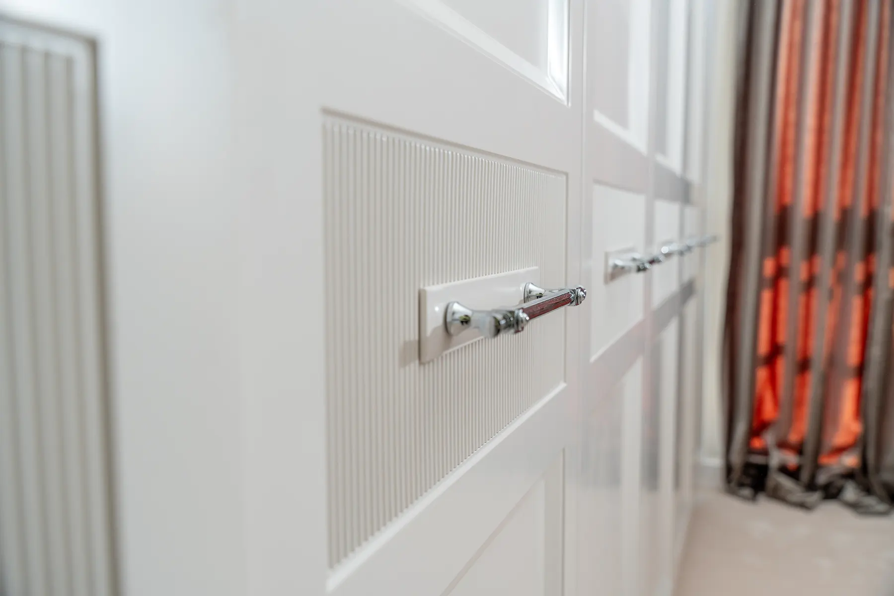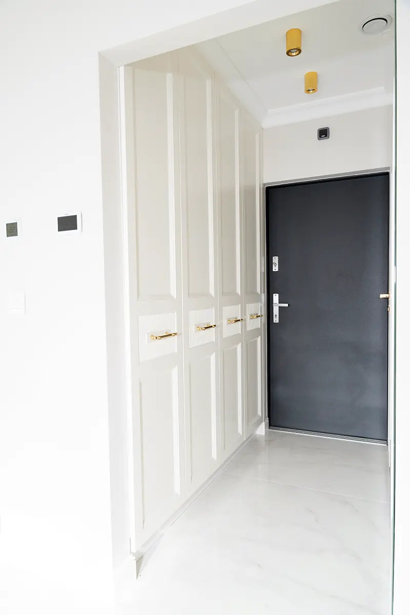 W naszej najnowszej realizacji postawiliśmy na połączenie funkcjonalności z wyrafinowanym stylem. Zabudowa szaf, stworzona według autorskiego projektu, prezentuje się niezwykle elegancko dzięki lakierowanym frontom. Dodatkowym atutem są ręcznie wykonane, mosiężne uchwyty, które dodają całości wyjątkowego charakteru.