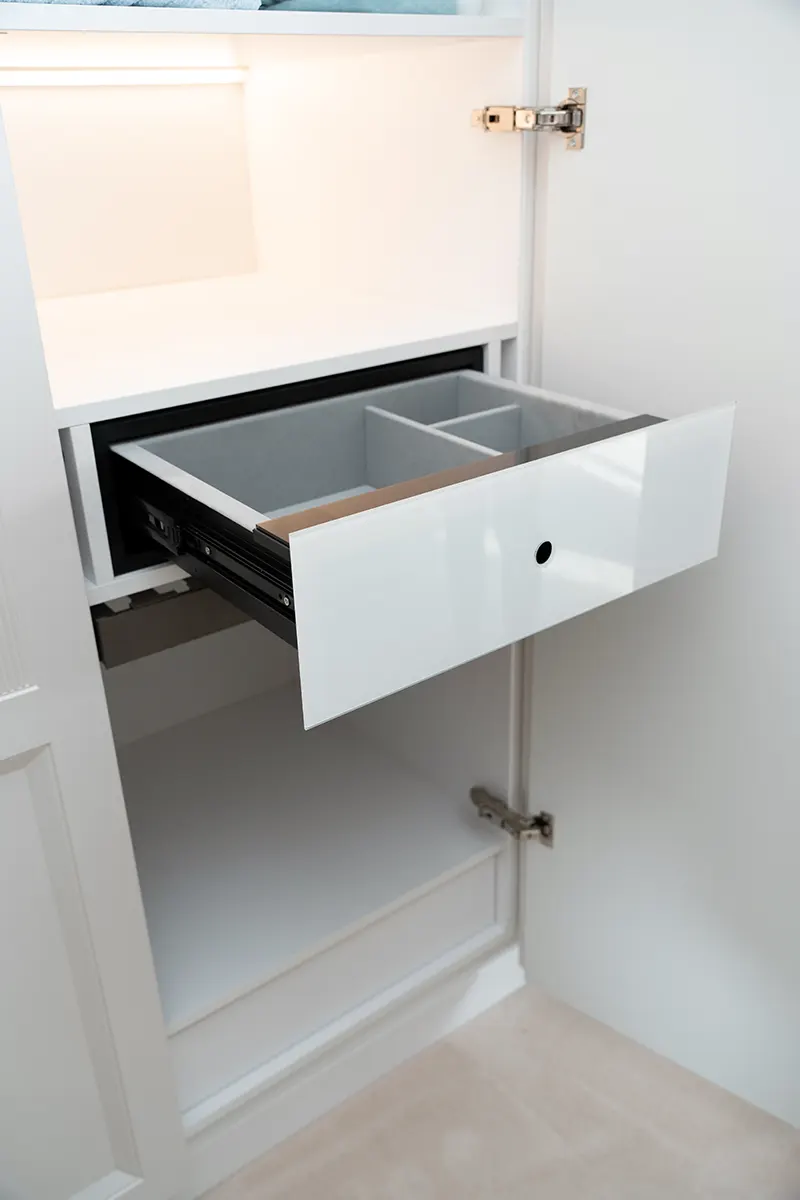 Bezpieczeństwo jest równie ważne, co design – dlatego wprowadziliśmy szufladę Safe Royal. To nie tylko elegancki element wyposażenia, ale przede wszystkim sejf na biżuterię z biometrycznym zabezpieczeniem na odcisk kciuka, gwarantujący, że cenne przedmioty będą bezpieczne.