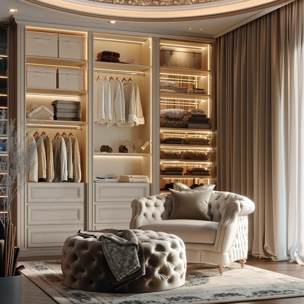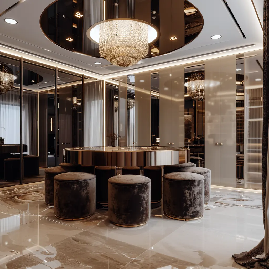Odpowiednie oświetlenie jest kluczowe w kreowaniu atmosfery. W garderobie w stylu Glamour świetnie sprawdzą się kryształowe żyrandole lub nowoczesne lampy z elementami szkła, które nie tylko rozświetlą przestrzeń, ale również staną się dekoracyjnym elementem. Ważne jest, by oświetlenie było regulowane, co pozwoli na stworzenie odpowiedniego nastroju w zależności od potrzeb.