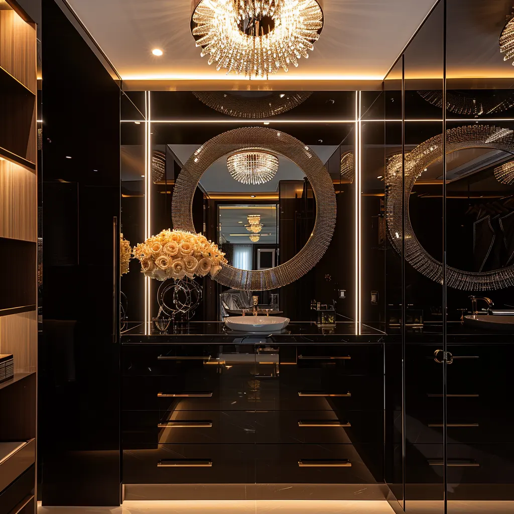 Styl Glamour charakteryzuje się bogactwem i elegancją. Wybierając kolorystykę, warto postawić na głębokie odcienie jak granat, burgund czy czarny, które możemy przełamać bielą lub złotem dla dodania przestrzeni lekkości i blasku. Materiały powinny być równie wykwintne – od aksamitnych tapet, przez lustrzane lub szklane fronty szafek, po metaliczne uchwyty i detale, które dodadzą każdej przestrzeni odrobiny luksusu.