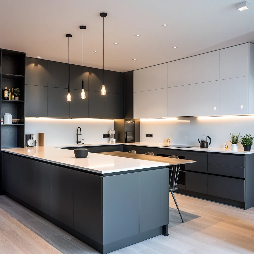 Zabudowa kuchenna w nowoczesnym wydaniu to przede wszystkim proste linie i geometryczne kształty. Świetnie sprawdzają się szafki bez uchwytów, z systemem push-to-open lub z dyskretnymi listwami uchwytowymi. Wybierając kolory frontów, postaw na spójną paletę barw. Obecnie popularne są zestawienia bieli lub szarości z drewnianymi elementami, które dodają przytulności. Warto też zwrócić uwagę na blaty – te same materiały możesz wykorzystać zarówno na blacie roboczym, jak i powierzchni stołu.