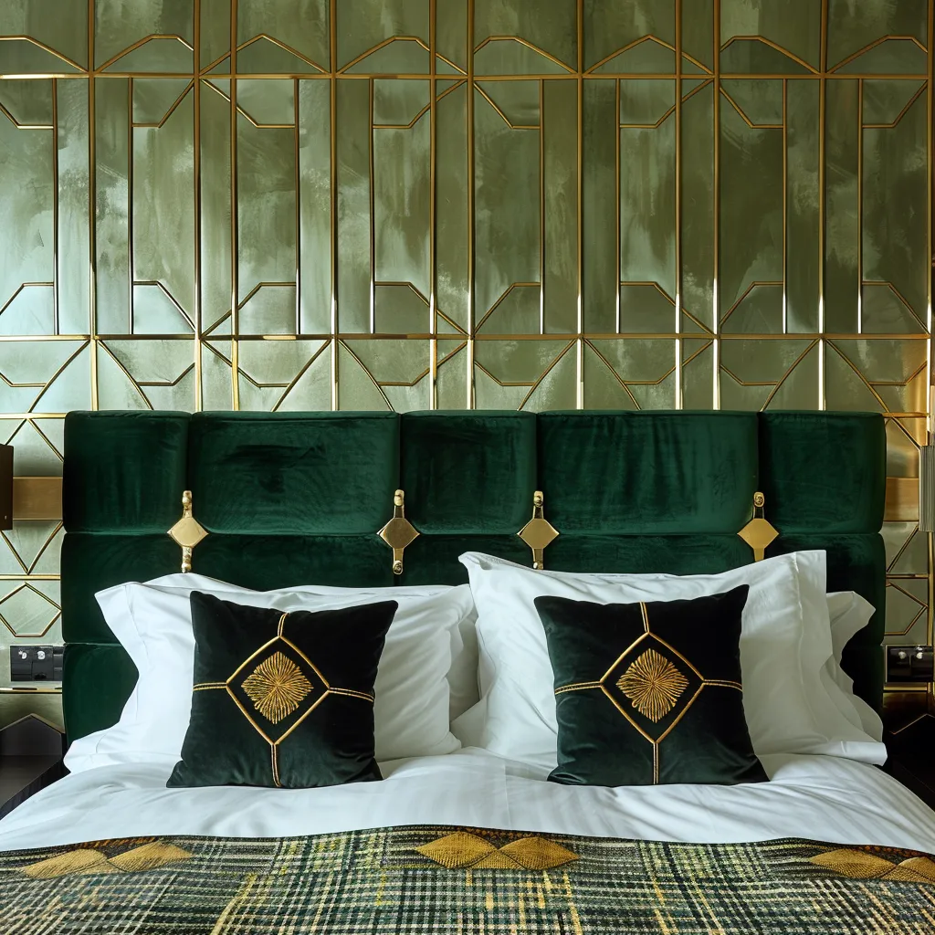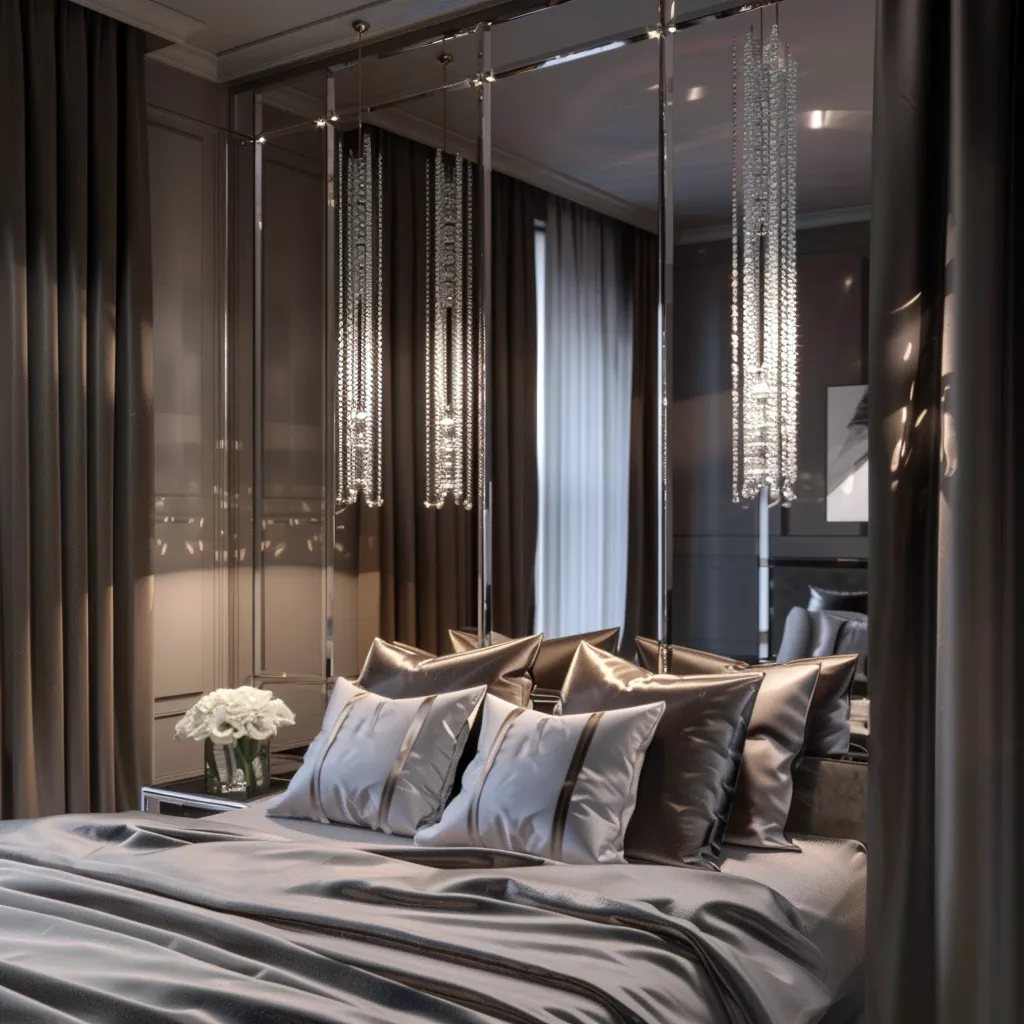 W sypialni glamour kluczową rolę odgrywają szlachetne materiały – aksamit i welur na tapicerowanych meblach, jedwabne zasłony czy puszyste dywany. Powierzchnie wykończone na wysoki połysk, elementy ze szkła i kryształu dodają elegancji i sprawiają, że światło pięknie rozprasza się po pomieszczeniu. Pikowane zagłówki łóżek, zdobione ramy luster czy dekoracyjne tapety budują charakterystyczny dla tego stylu przepych, jednak kluczem do sukcesu jest umiejętne balansowanie między dekoracyjnością a elegancją.