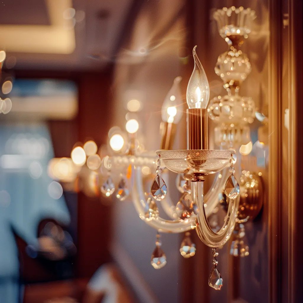 Oświetlenie w sypialni glamour pełni nie tylko funkcję praktyczną, ale przede wszystkim dekoracyjną. Centralnym elementem jest efektowny żyrandol z kryształowymi zdobieniami, który staje się prawdziwą ozdobą wnętrza. Światło załamujące się w kryształach tworzy magiczną grę świateł na ścianach i suficie, dodając pomieszczeniu tajemniczego charakteru.